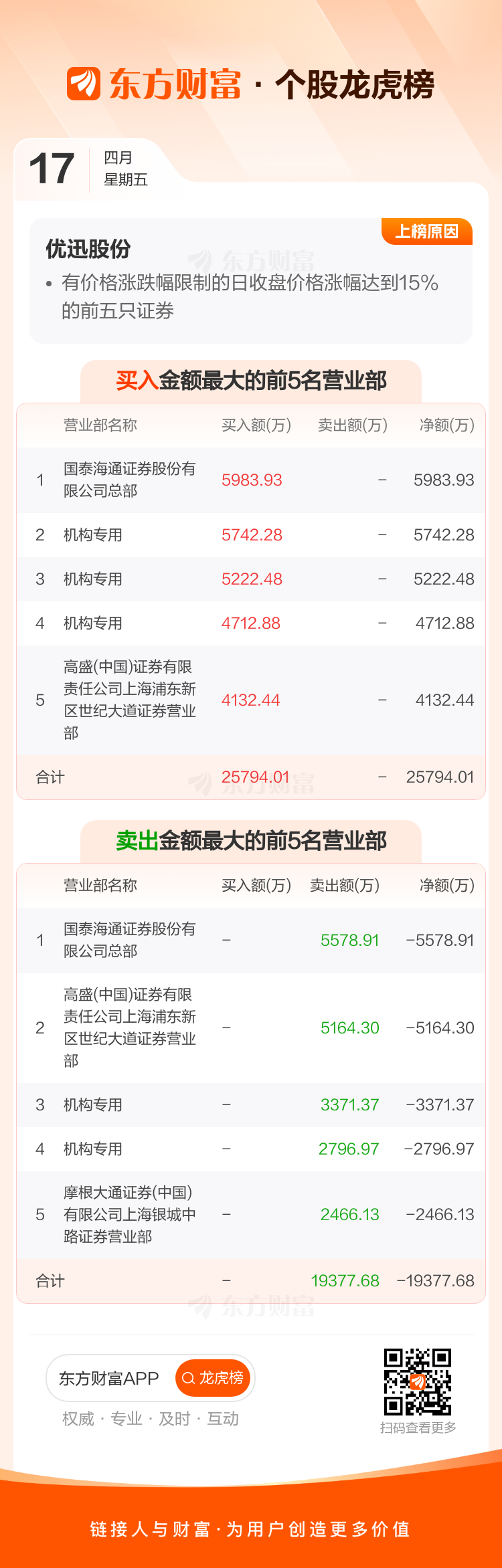 交易所2026年4月17日公布的交易公开信息显示,优迅股份因成为有价格涨跌幅限制的日收盘价格涨幅达到15%的前五只证券上榜。优迅股份当日收报363.19元,涨跌幅20.00%,偏离值20.00%,换手率20.50%,成交额10.78亿。