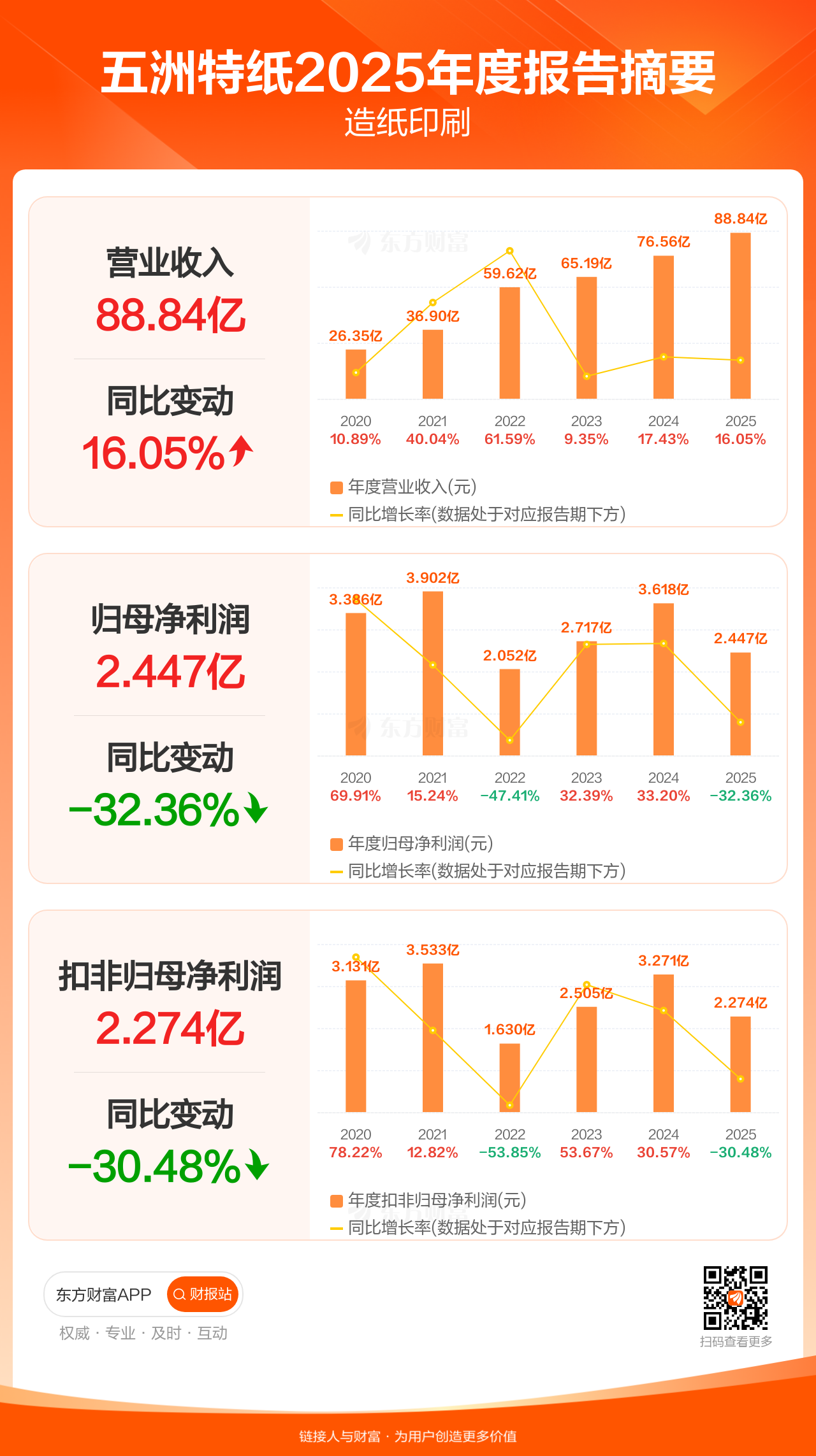 五洲特纸4月18日发布2025年年报显示,公司全年实现营业收入88.84亿元,同比增长16.05%;归母净利润2.45亿元,同比下滑32.36%;扣非归母净利润2.27亿元,同比下滑30.48%。