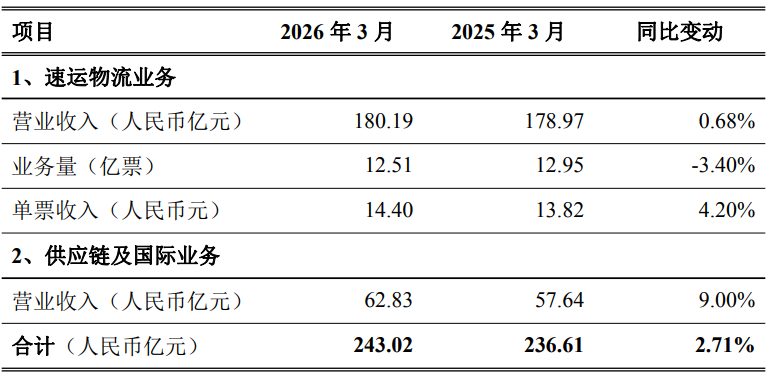 4月17日,顺丰控股(002352/06936)发布公告,2026年3月的快递物流业务经营简报显示,公司速运物流业务和供应链及国际业务合计收入为243.02亿元,同比增长2.71%。