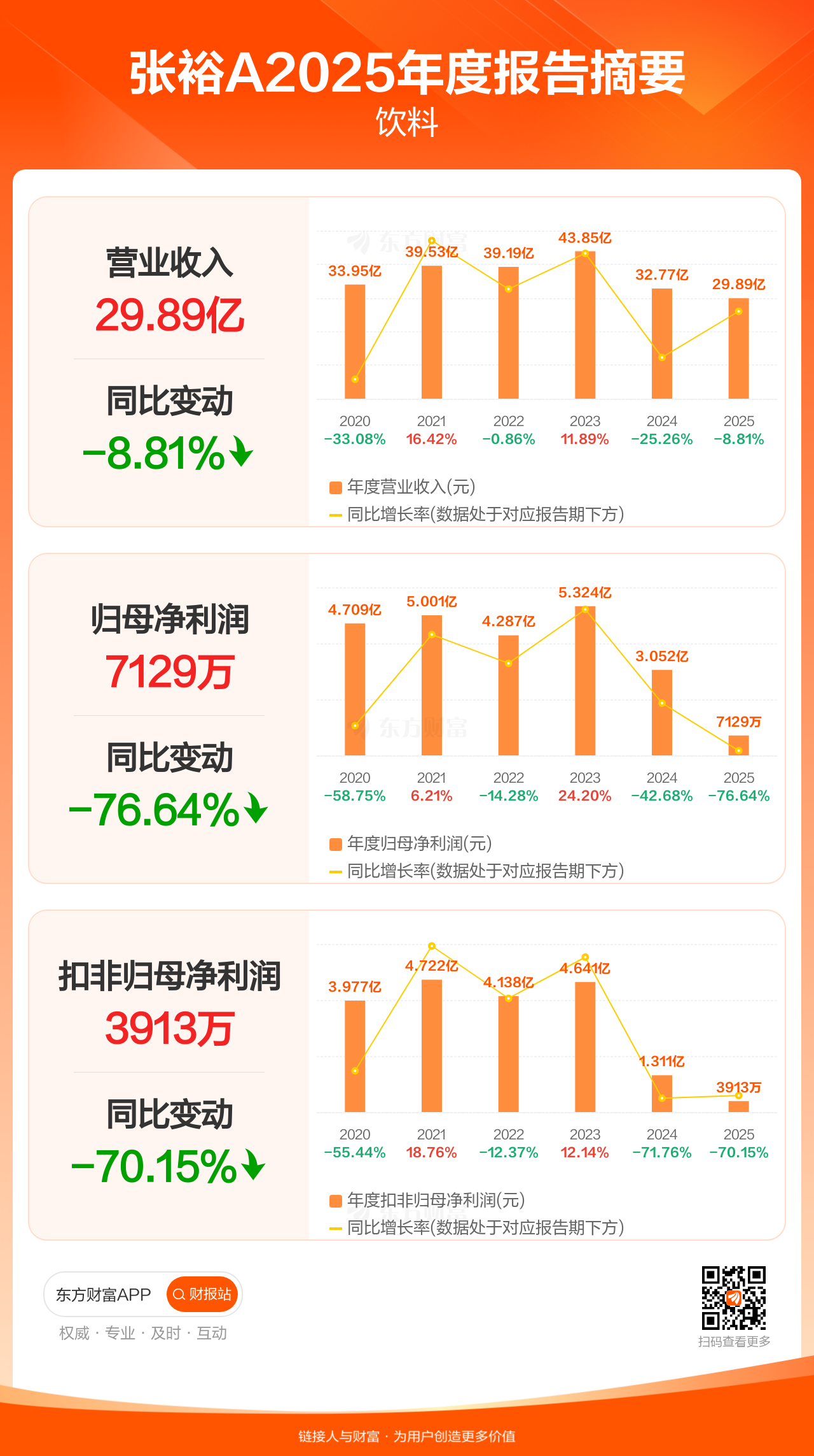 张裕A4月18日发布2025年年报显示,公司全年实现营业收入29.89亿元,同比下滑8.81%;归母净利润7129.13万元,同比下滑76.64%;扣非归母净利润3912.82万元,同比下滑70.15%。