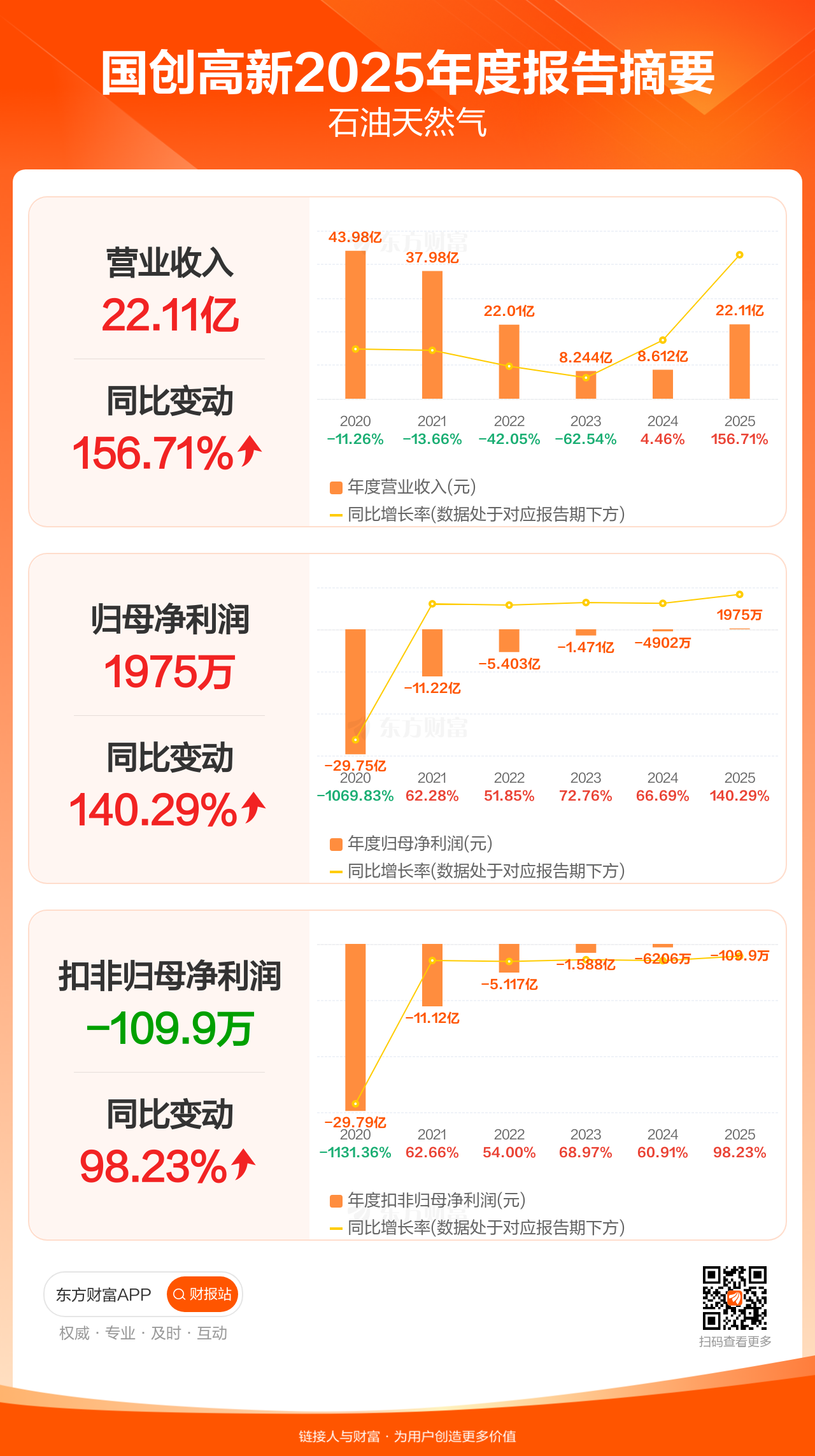 国创高新4月18日发布2025年年报显示,公司全年实现营业收入22.11亿元,同比增长156.71%;归母净利润1975.16万元,同比增长140.29%;扣非归母净利润-109.85万元。