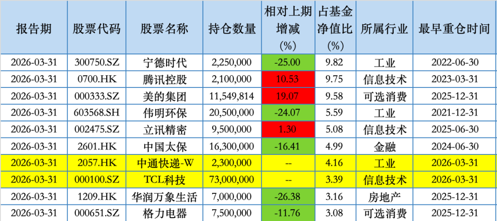 其中,中通快递、TCL科技首次进入持仓前十。相较于2025年末,赵枫在2026年一季度期间增持了60万股的中通快递;而他在2025年下半年首次建仓TCL科技后,在2026年一季度期间再增持了4300万股。