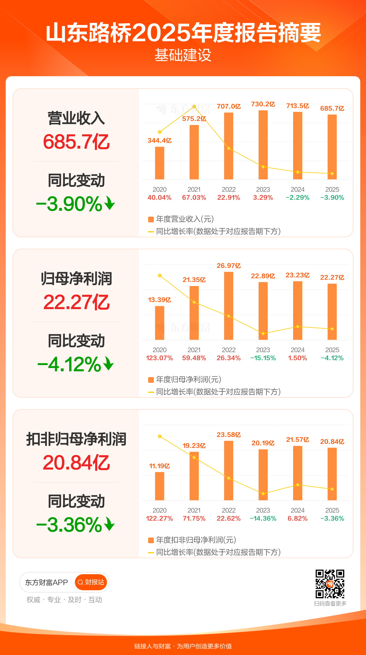 山东路桥4月18日发布2025年年报显示,公司全年实现营业收入685.68亿元,同比下滑3.90%;归母净利润22.27亿元,同比下滑4.12%;扣非归母净利润20.84亿元,同比下滑3.36%。