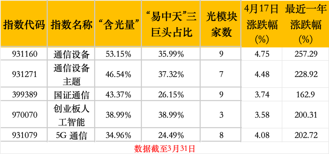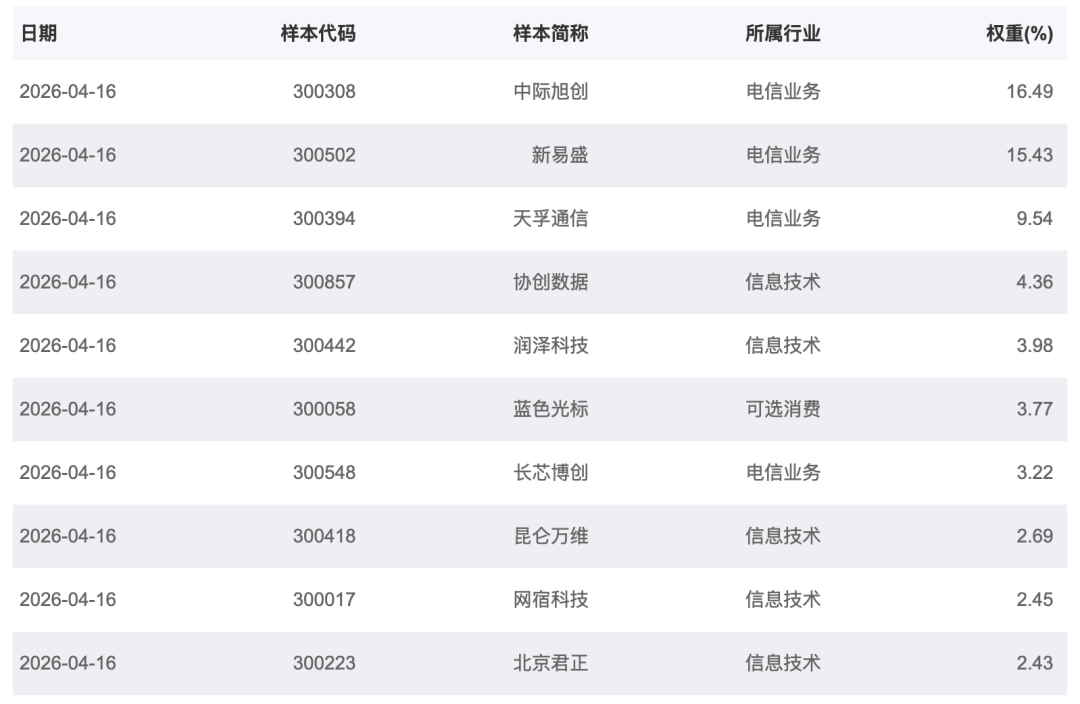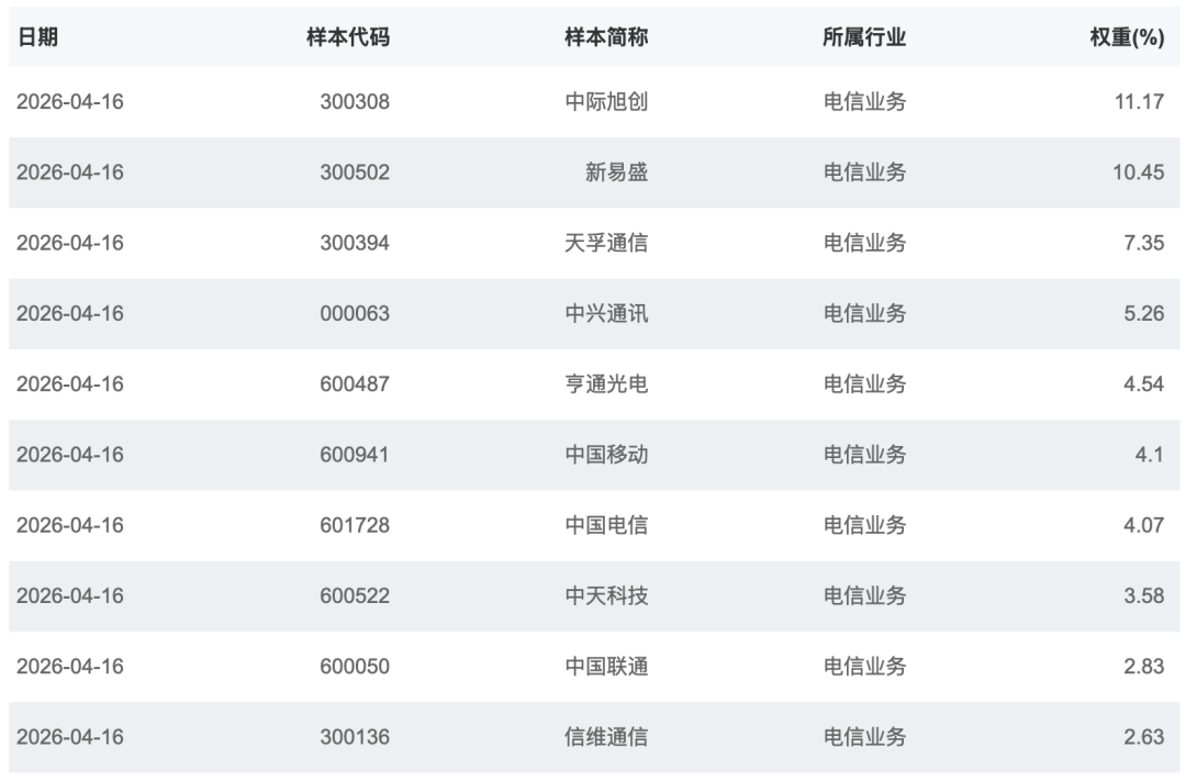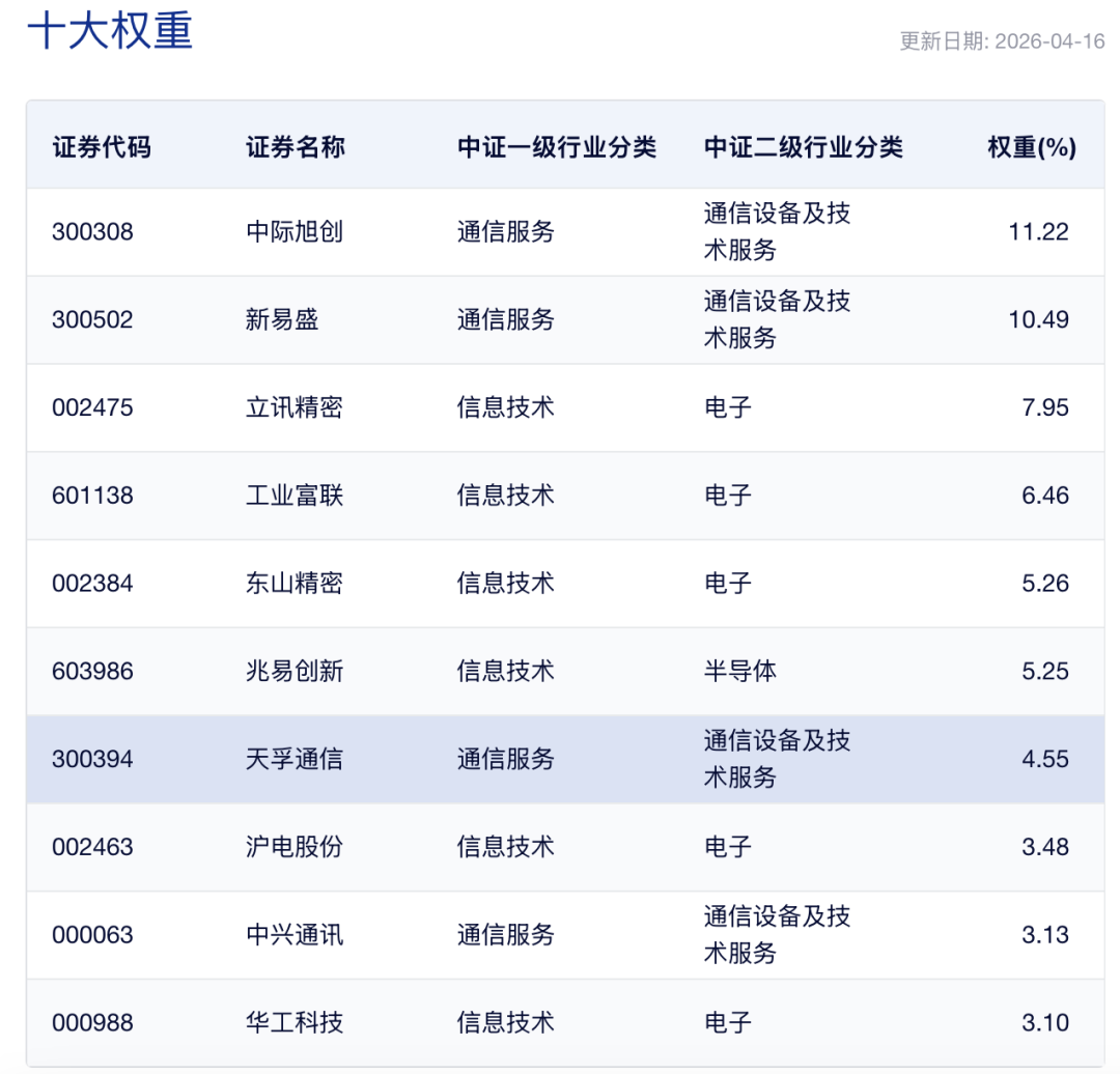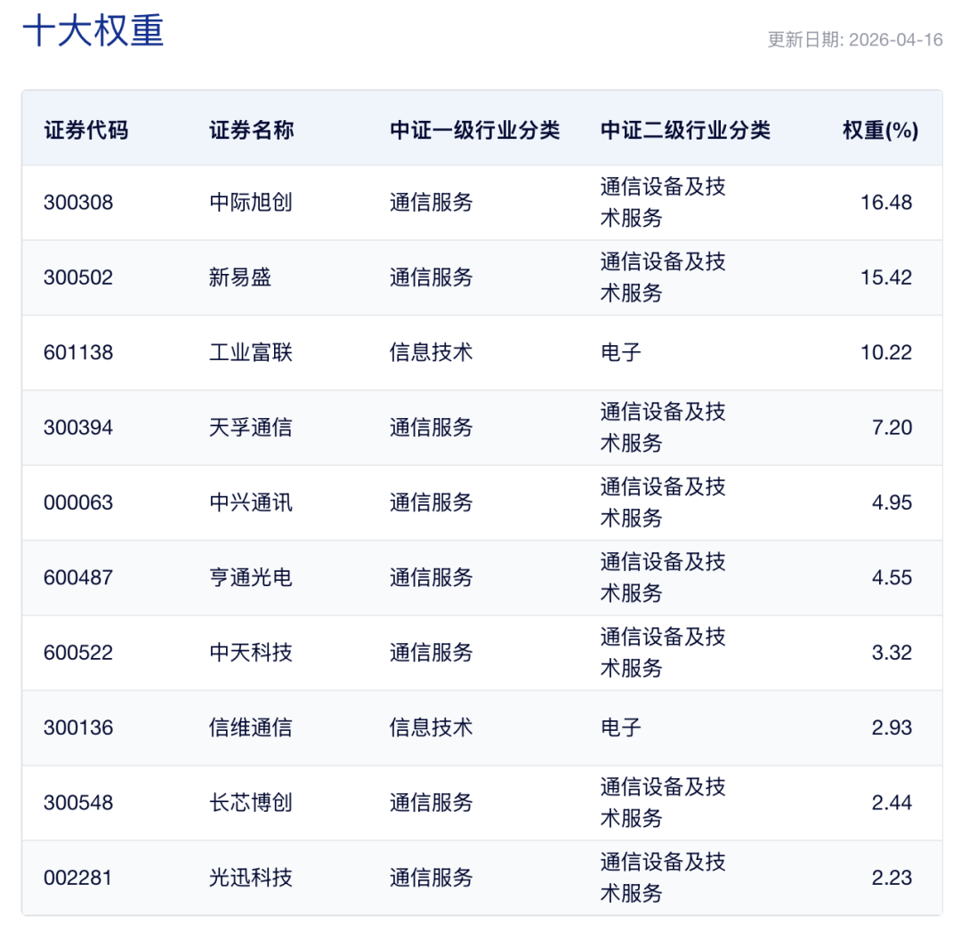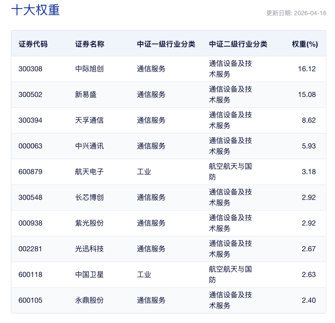 中证通信设备主题指数 (931271):中证通信设备主题指数选取50只业务涉及通信设备制造、通信技术服务以及卫星互联网建设等领域的上市公司证券作为指数样本,反映通信设备主题上市公司证券的整体表现。截至4月16日,“易中天”占据前三大权重股,合计占比超过37%。