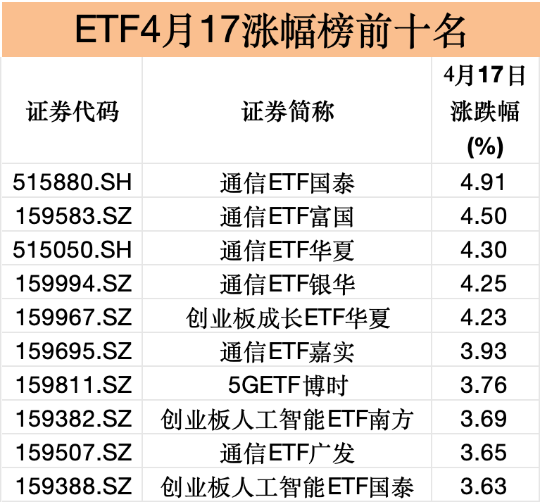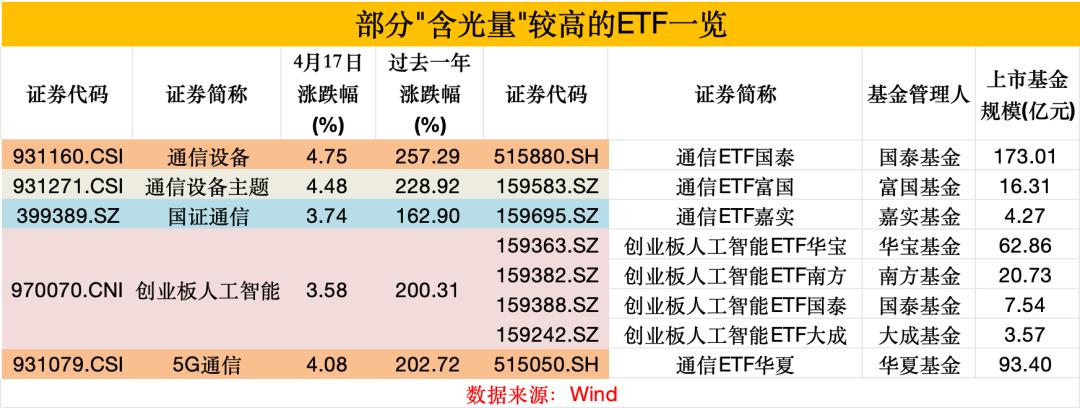 在光模块板块带动下,多只成份股中含光模块较高的ETF集体爆发。多只通信ETF领涨,包括通信ETF国泰、通信ETF富国、通信ETF华夏、通信ETF银华在内的4只ETF均涨超4%,创业板成长ETF华夏也上涨4.23%。