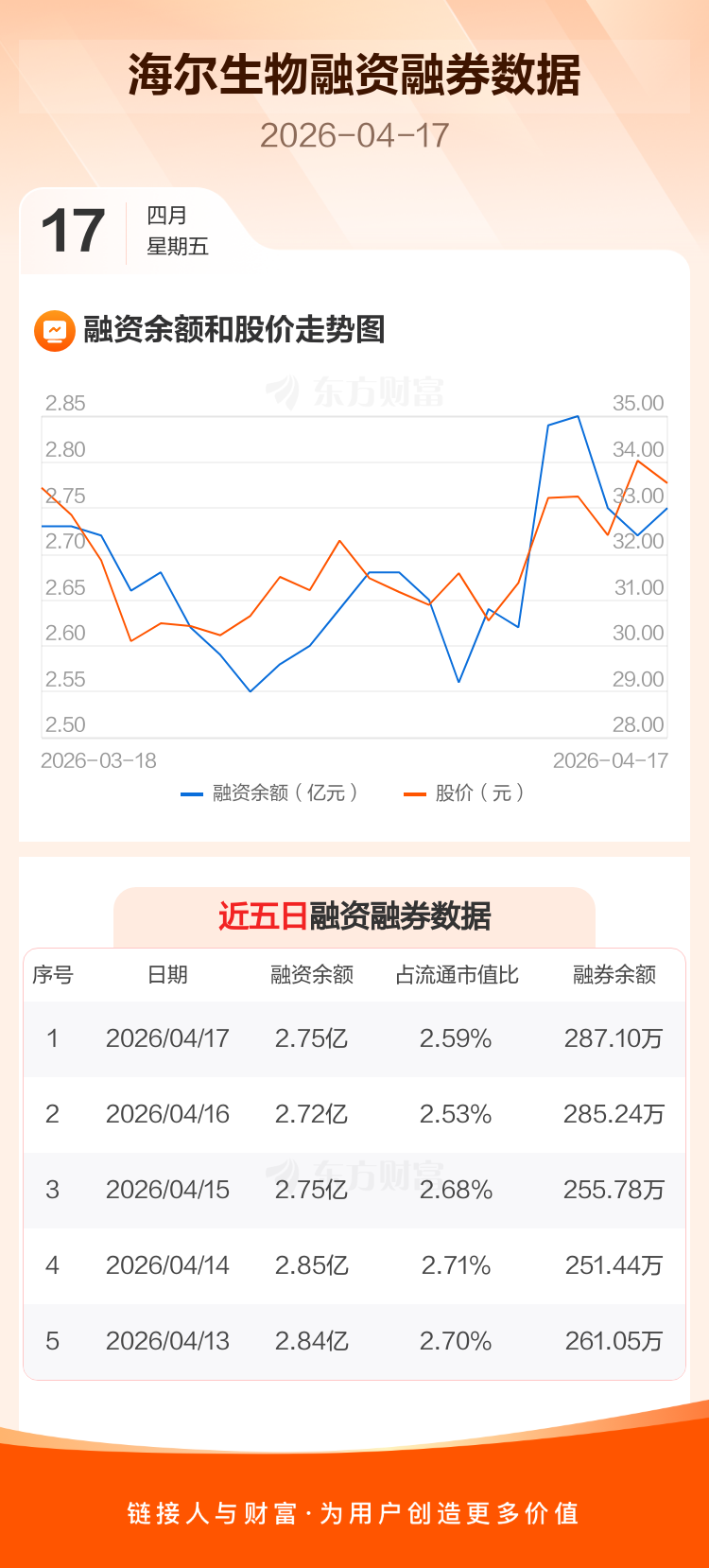 交易所最新数据显示,海尔生物于2026年4月17日获融资买入2093.15万元,融资偿还1812.81万元,当日融资净买入280.34万元。目前,该股融资余额2.75亿,占流通市值比例为2.59%。