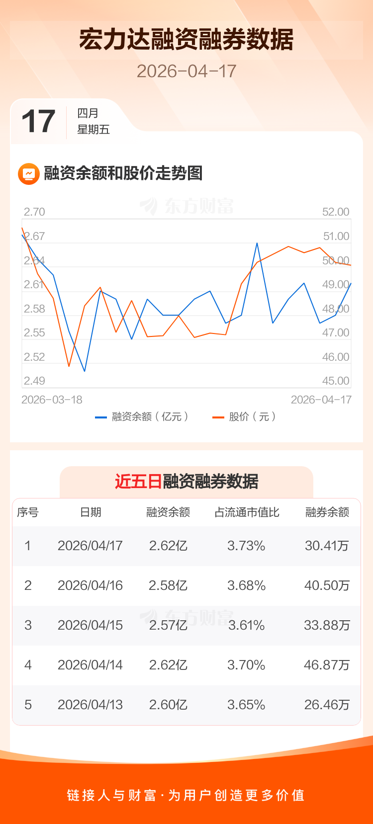 交易所最新数据显示,宏力达于2026年4月17日获融资买入1792.47万元,融资偿还1465.35万元,当日融资净买入327.12万元。目前,该股融资余额2.62亿,占流通市值比例为3.73%。