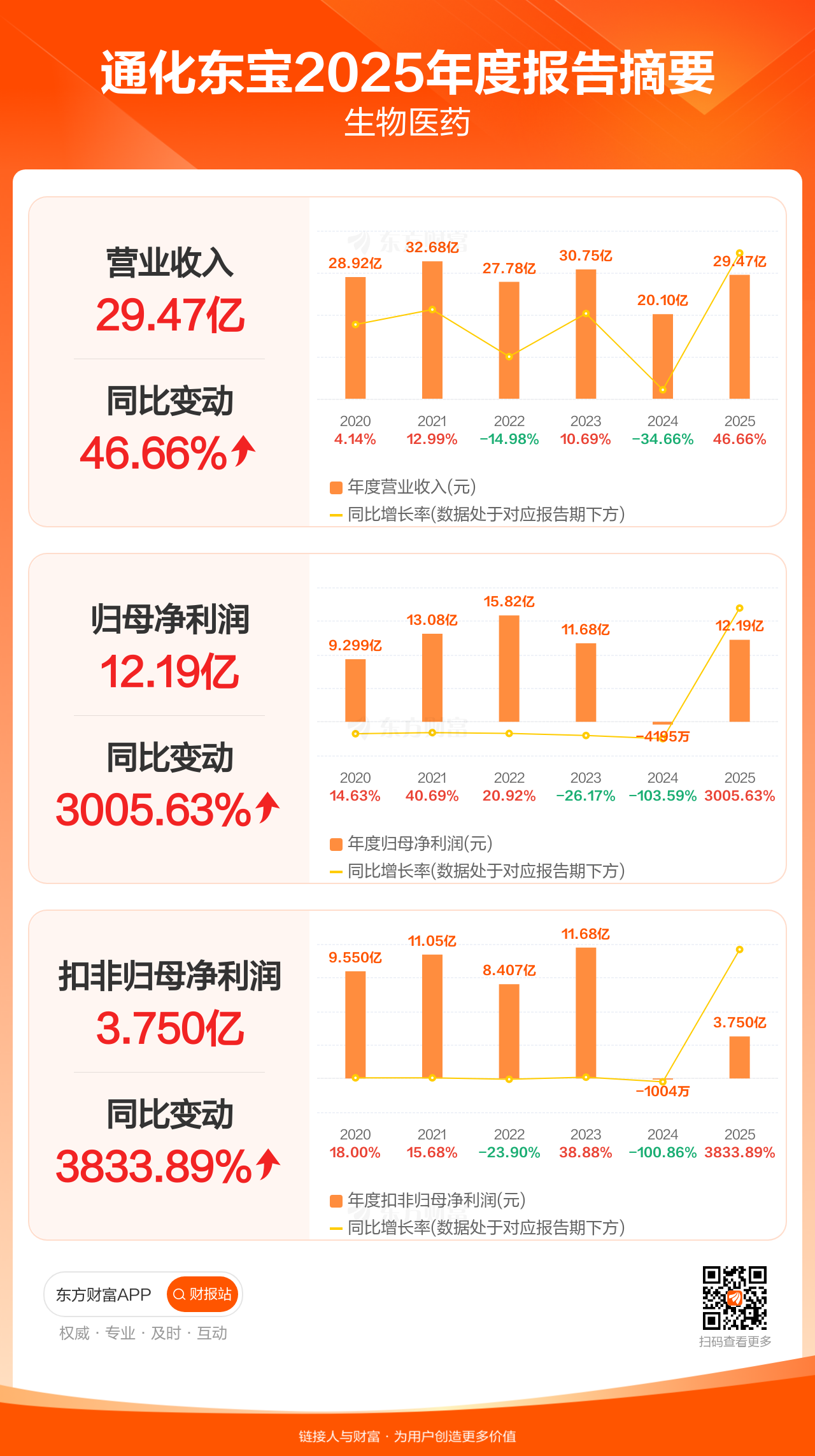 通化东宝4月20日发布2025年年报显示,公司全年实现营业收入29.47亿元,同比增长46.66%;归母净利润12.19亿元,同比增长3005.63%;扣非归母净利润3.75亿元,同比增长3833.89%。