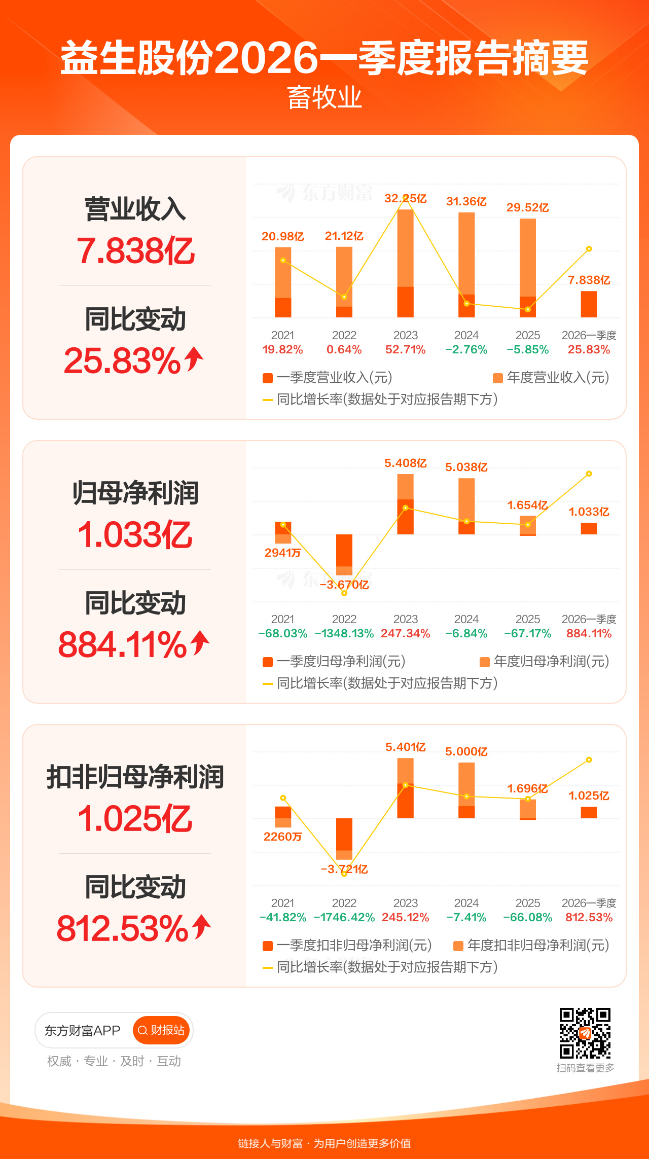 益生股份4月20日发布2026年一季报显示,公司一季度实现营业收入7.84亿元,同比增长25.83%;归母净利润1.03亿元,同比增长884.11%;扣非归母净利润1.03亿元,同比增长812.53%。