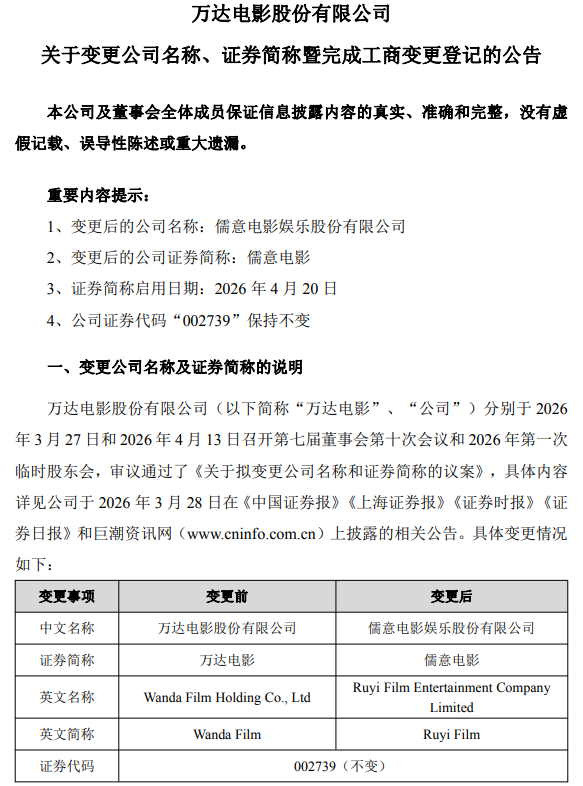 万达电影(002739.SZ)公告称,公司已完成工商变更登记手续,并取得换发的《营业执照》。公司名称由“万达电影股份有限公司”变更为“儒意电影娱乐股份有限公司”,证券简称由“万达电影”变更为“儒意电影”,证券代码“002739”保持不变。新证券简称自2026年4月20日起启用。