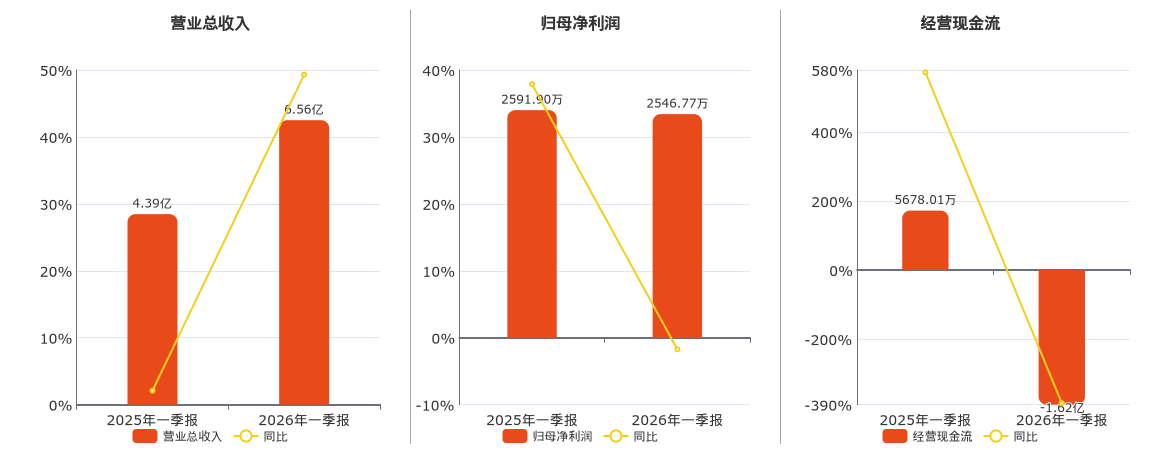 公司营业总收入为6.56亿元。归母净利润为2546.77万元,较去年同报告期归母净利润减少45.13万元,同比较去年同期下降1.74%。经营活动现金净流入为-1.62亿元,较去年同报告期经营活动现金净流入减少2.19亿元,同比较去年同期下降385.75%。