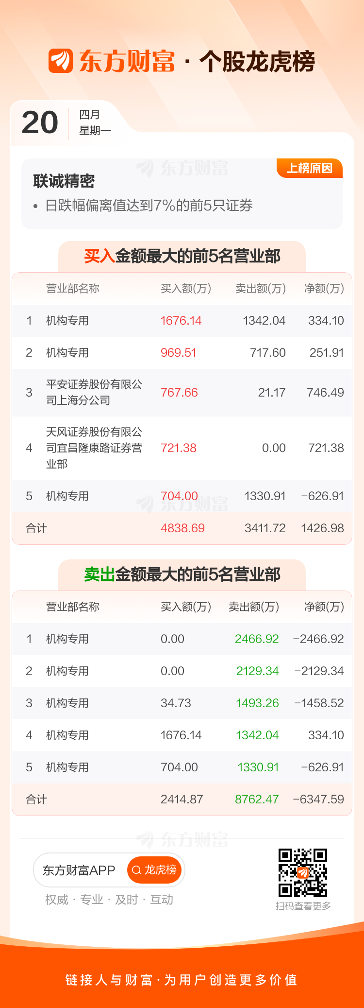 交易所2026年4月20日公布的交易公开信息显示,联诚精密因成为日跌幅偏离值达到7%的前5只证券上榜。联诚精密当日收报24.51元,涨跌幅-7.75%,偏离值-8.43%,换手率10.72%,成交额3.47亿。