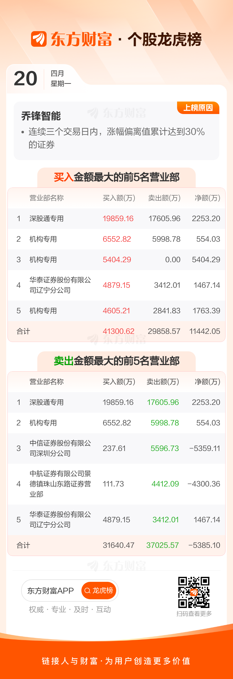 交易所2026年4月20日公布的交易公开信息显示,乔锋智能因成为连续三个交易日内,涨幅偏离值累计达到30%的证券上榜。乔锋智能当日收报103.5元,涨跌幅9.52%,换手率27.30%,成交额10.73亿。异常期间4月16日至4月20日,期间涨幅37.38%,累计偏离值33.45%,区间成交额33.09亿。