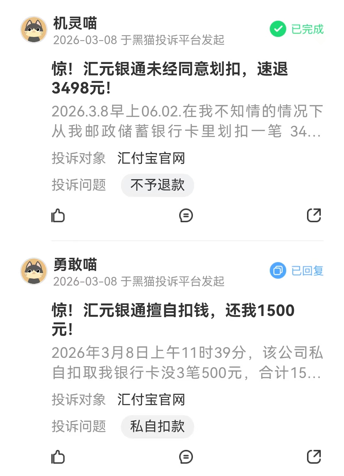 此外,汇元银通还频遭消费者投诉,密集指向其收砍头息、变相高利贷以及违规乱扣费、收取高额权益费等问题。投诉对象均为汇付宝官网,而收款方汇付宝正是汇元银通旗下的支付品牌。