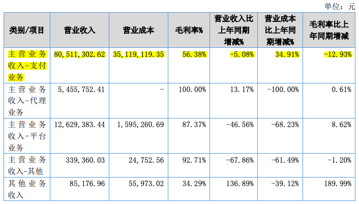 值得注意的是,汇元银通作为公司从事第三方支付业务的核心平台,2025年上半年净利润却亏损1266.51 万元,成为拖累公司盈利的重要因素。同时,汇元科技营收占比超八成的支付业务毛利率由上年同期的69.31%下降12.93个百分点至56.38%。