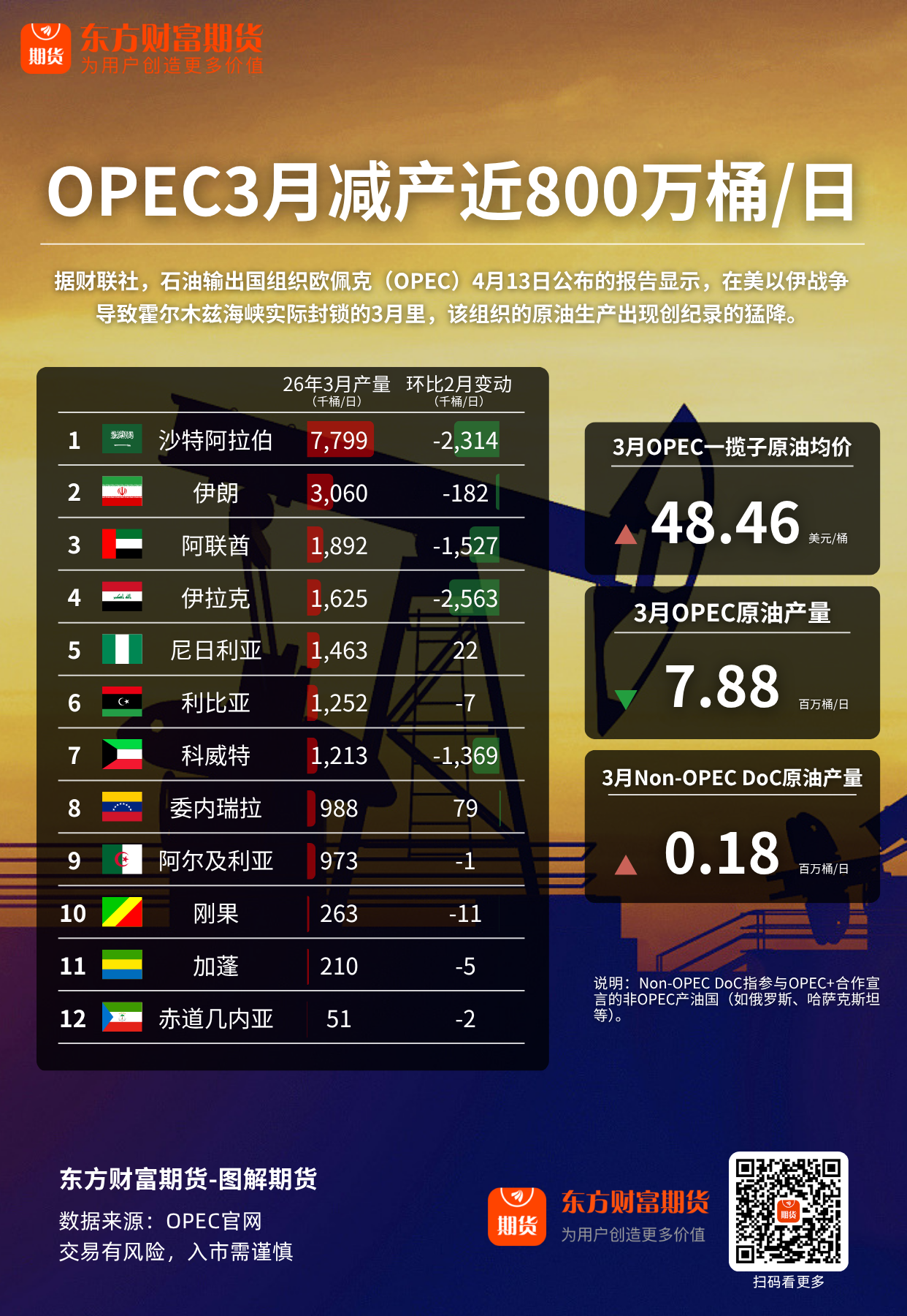 据财联社,石油输出国组织欧佩克(OPEC)4月13日公布的报告显示,在美以伊战争导致霍尔木兹海峡实际封锁的3月里,该组织的原油生产出现创纪录的猛降。