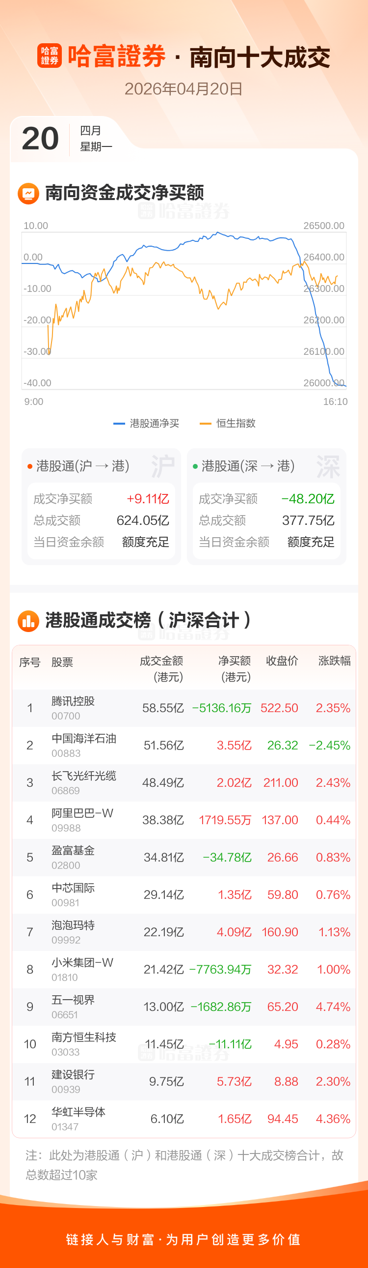 恒生指数4月20日涨0.77%,收报26361.07点。南向资金今日净卖出港股39.09亿港元。南向资金今日成交额1001.80亿港元,港股大市成交2414.63亿港元。