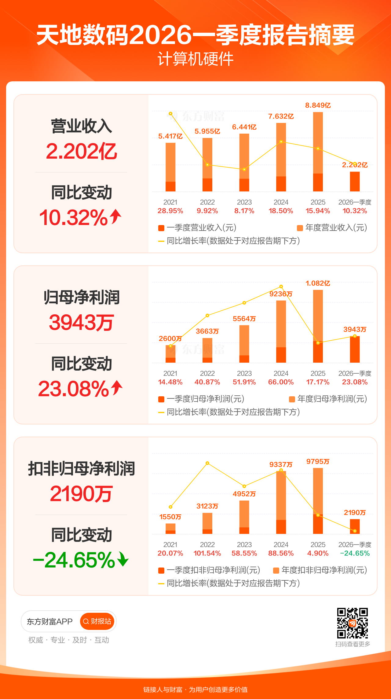 天地数码4月21日发布2026年一季报显示,公司一季度实现营业收入2.20亿元,同比增长10.32%;归母净利润3943.04万元,同比增长23.08%;扣非归母净利润2189.87万元,同比下滑24.65%。
