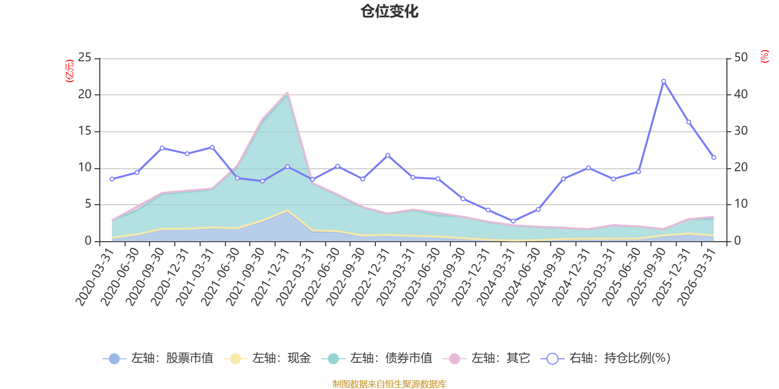 据定期报告数据统计,近三年平均股票仓位为18.69%,同类平均为72.6%。2025年三季度末基金达到43.74%的最高仓位,2024年一季度末最低,为5.57%。