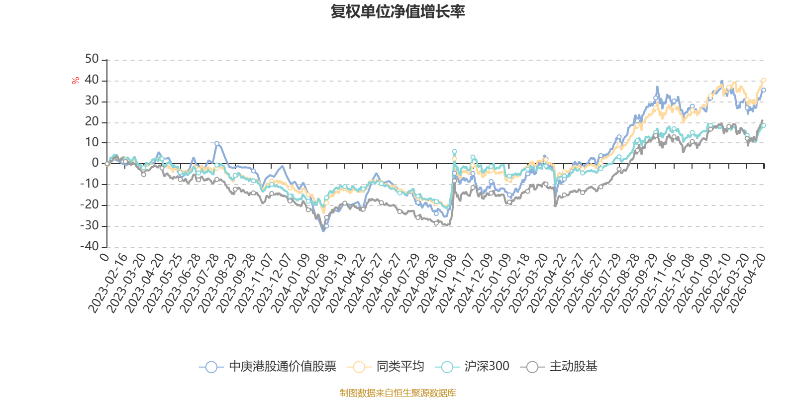 截至4月20日,中庚港股通价值股票近三个月复权单位净值增长率为1.33%,位于同类可比基金31/58;近半年复权单位净值增长率为5.64%,位于同类可比基金40/58;近一年复权单位净值增长率为48.60%,位于同类可比基金20/57;近三年复权单位净值增长率为28.18%,位于同类可比基金34/57。
