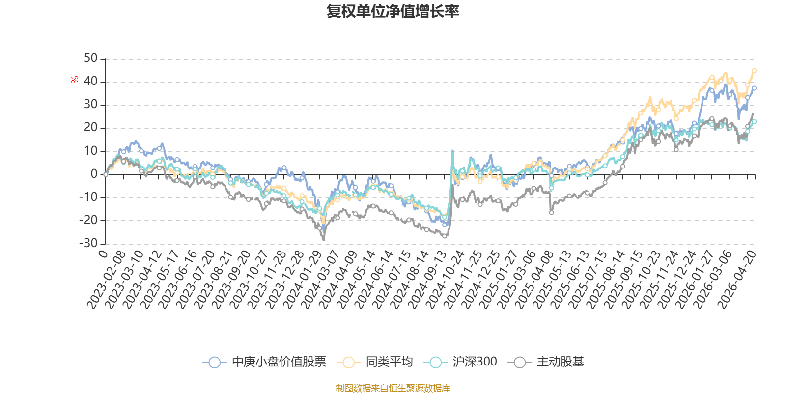 截至4月20日,中庚小盘价值股票近三个月复权单位净值增长率为1.07%,位于同类可比基金34/58;近半年复权单位净值增长率为14.61%,位于同类可比基金25/58;近一年复权单位净值增长率为36.41%,位于同类可比基金36/57;近三年复权单位净值增长率为23.65%,位于同类可比基金38/57。