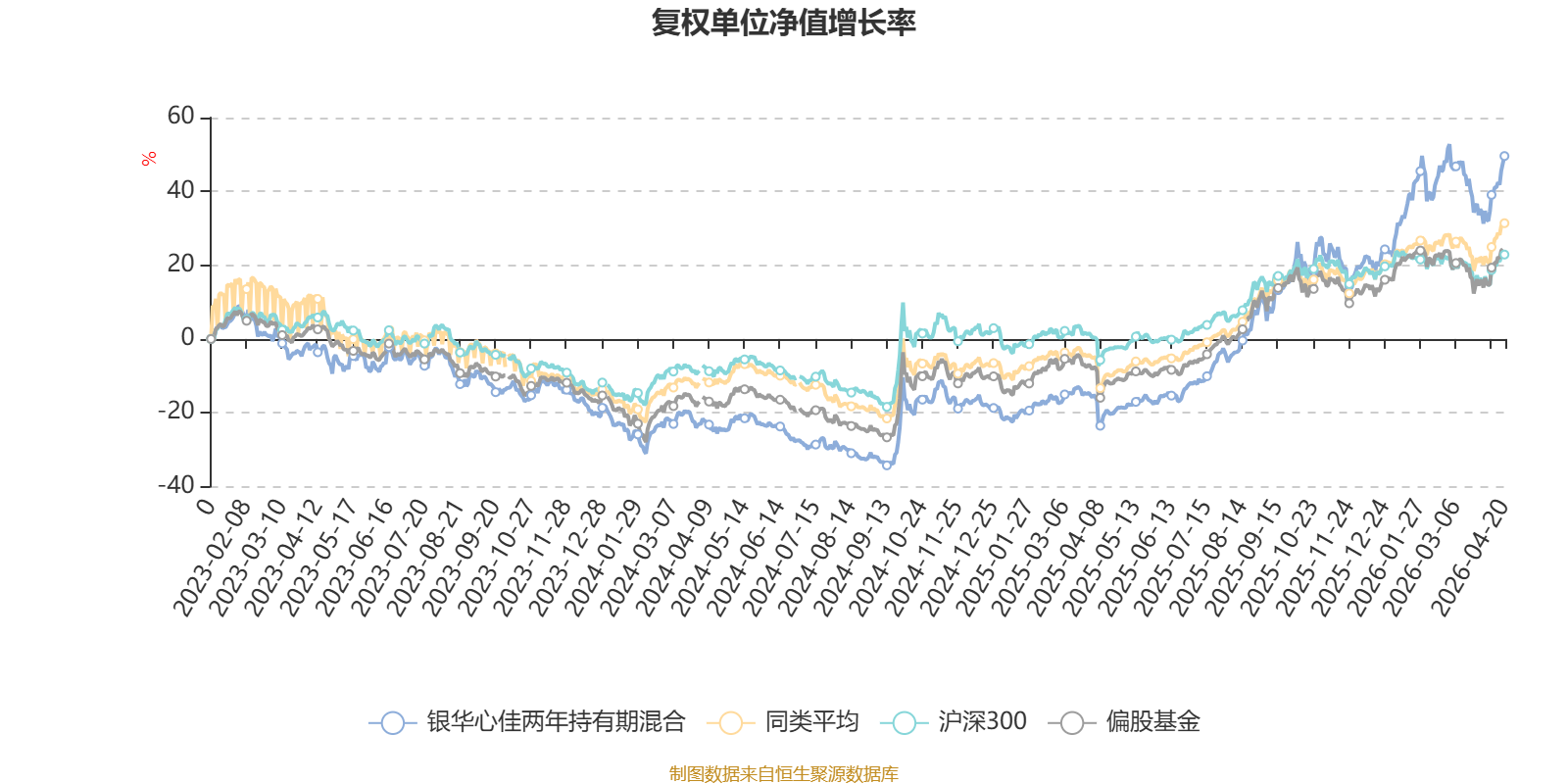 截至4月20日,银华心佳两年持有期混合近三个月复权单位净值增长率为8.68%,位于同类可比基金5/20;近半年复权单位净值增长率为28.04%,位于同类可比基金3/20;近一年复权单位净值增长率为87.45%,位于同类可比基金4/20;近三年复权单位净值增长率为57.50%,位于同类可比基金3/19。