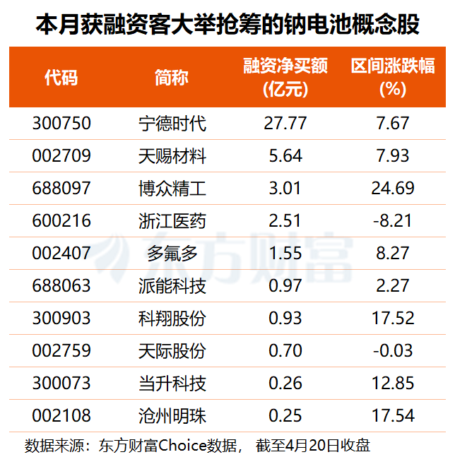 从资金角度看,东方财富Choice数据显示,本月共有16只钠电池概念股获得超千万元融资净买入,其中,宁德时代获融资客大举抢筹27.77亿元,天赐材料获杠杆资金加仓5.64亿元,博众精工、浙江医药、多氟多融资净买额分别达3.01亿、2.51亿和1.55亿元,派能科技、科翔股份亦获超9000万元融资净买入。