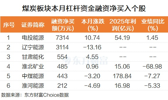 本月以来,煤炭板块部分个股被杠杆资金积极抢筹。比如电投能源被杠杆资金融资净买入7314万元。辽宁能源也被融资净买入超千万,为3114万元。股价表现来看,电投能源本月累计涨幅超10%;甘肃能化、淮北矿业小幅上涨。