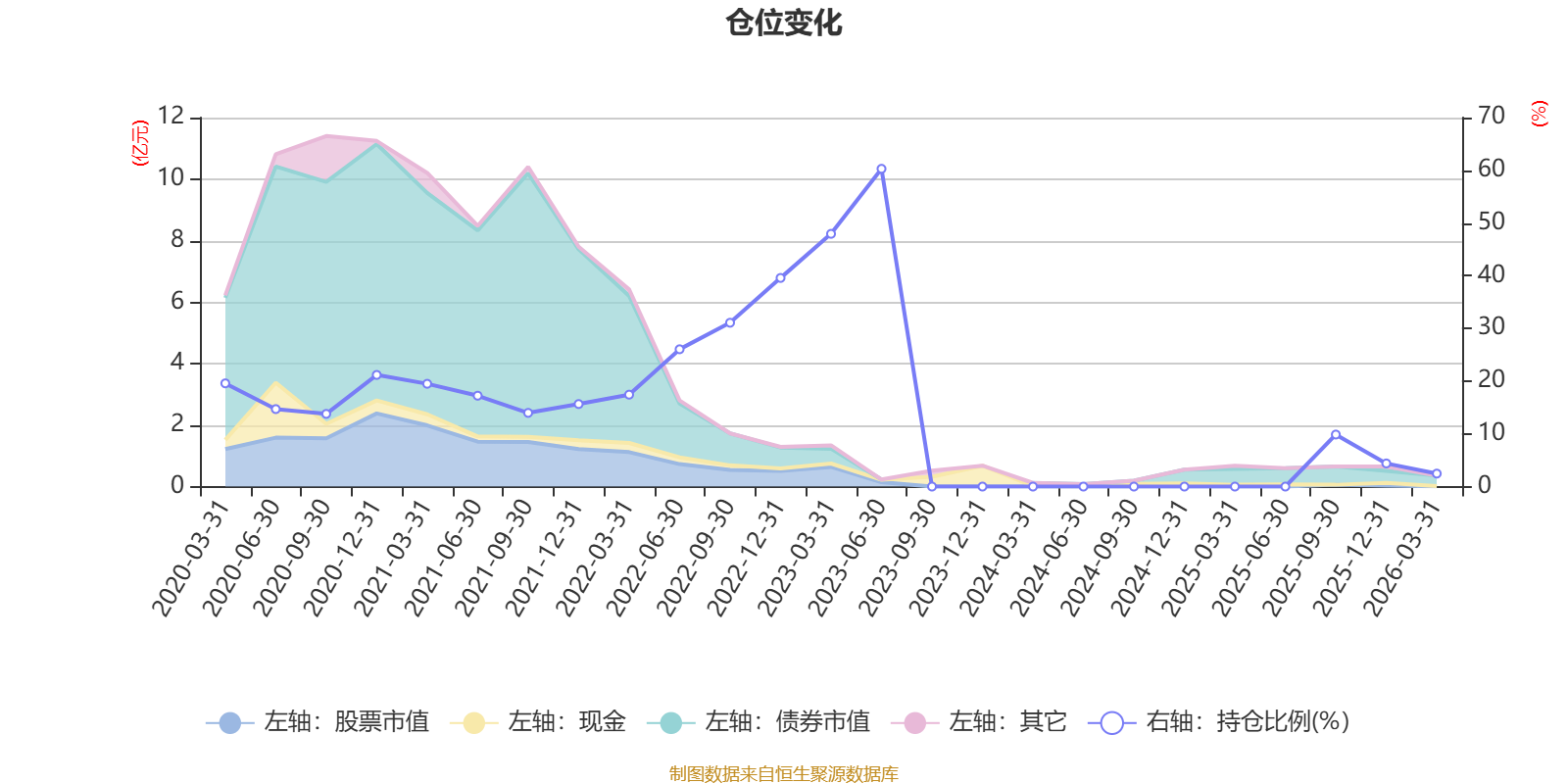 据定期报告数据统计,近三年平均股票仓位为6.42%,同类平均为48.83%。2023年上半年末基金达到60.29%的最高仓位,2026年一季度末最低,为2.46%。