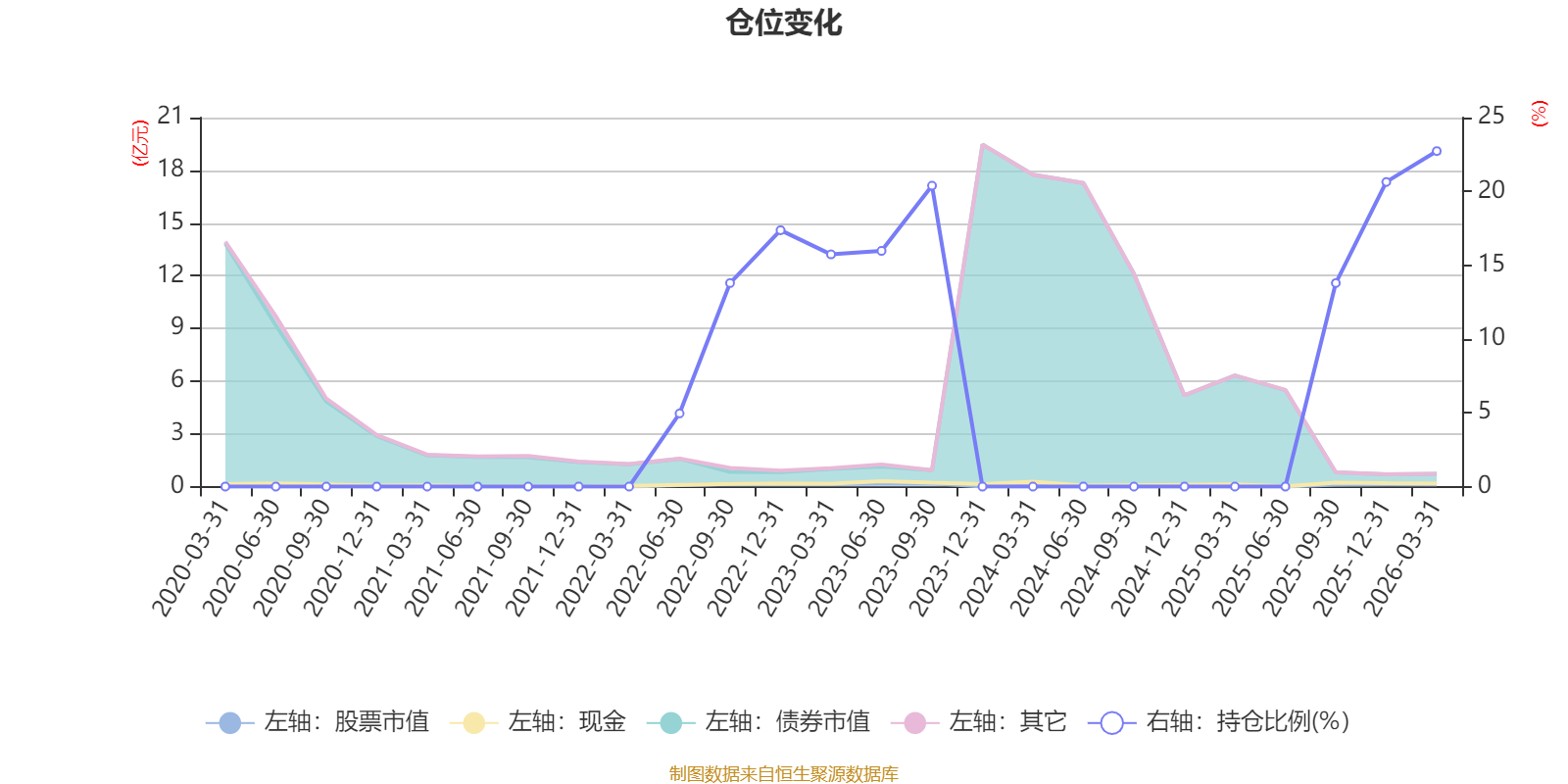 据定期报告数据统计,近三年平均股票仓位为7.79%,同类平均为19.28%。2026年一季度末基金达到22.73%的最高仓位,2022年上半年末最低,为4.96%。