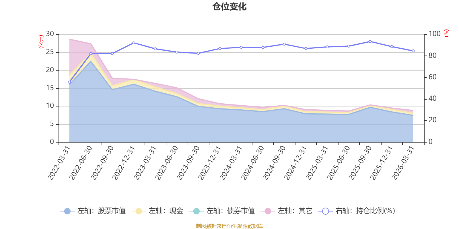 据定期报告数据统计,近三年平均股票仓位为87.54%,同类平均为86.03%。2025年三季度末基金达到93.38%的最高仓位,2022年一季度末最低,为55.64%。