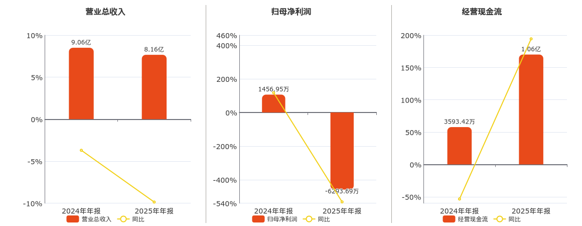公司营业总收入为8.16亿元,较去年同报告期营业总收入减少8928.29万元,同比较去年同期下降9.86%。归母净利润为-6293.69万元,较去年同报告期归母净利润减少7750.64万元,同比较去年同期下降531.98%。经营活动现金净流入为1.06亿元。