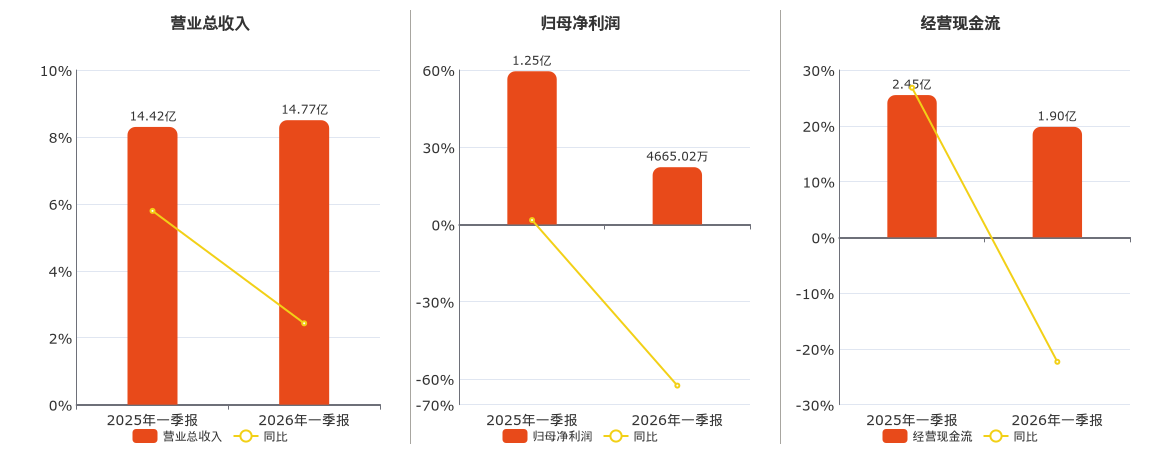 公司营业总收入为14.77亿元。归母净利润为4665.02万元,较去年同报告期归母净利润减少7809.32万元,同比较去年同期下降62.60%。经营活动现金净流入为1.90亿元,较去年同报告期经营活动现金净流入减少5466.67万元,同比较去年同期下降22.32%。