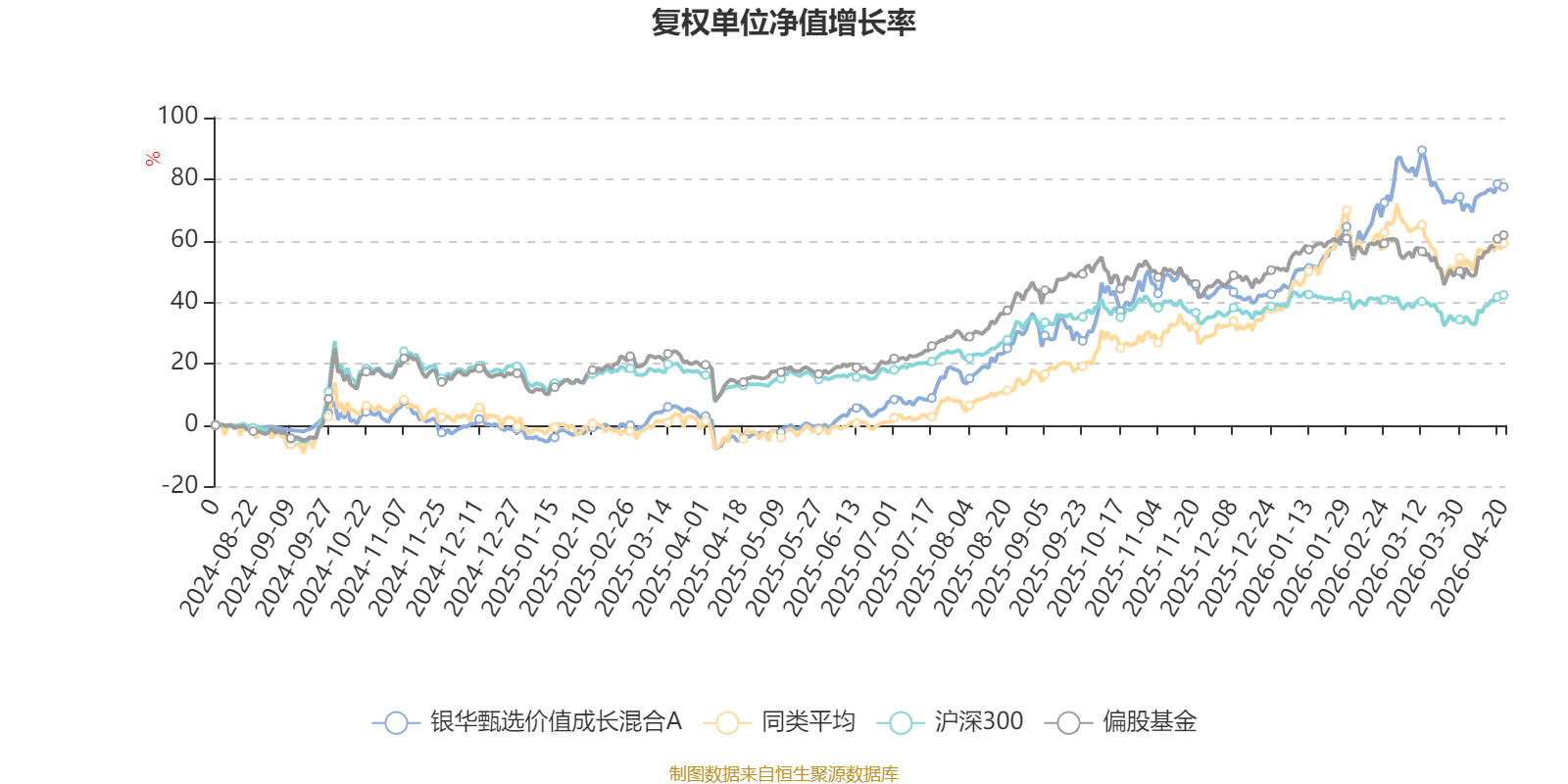 截至4月20日,银华甄选价值成长混合A近三个月复权单位净值增长率为14.43%,位于同类可比基金5/49;近半年复权单位净值增长率为28.29%,位于同类可比基金20/49;近一年复权单位净值增长率为85.35%,位于同类可比基金16/48。