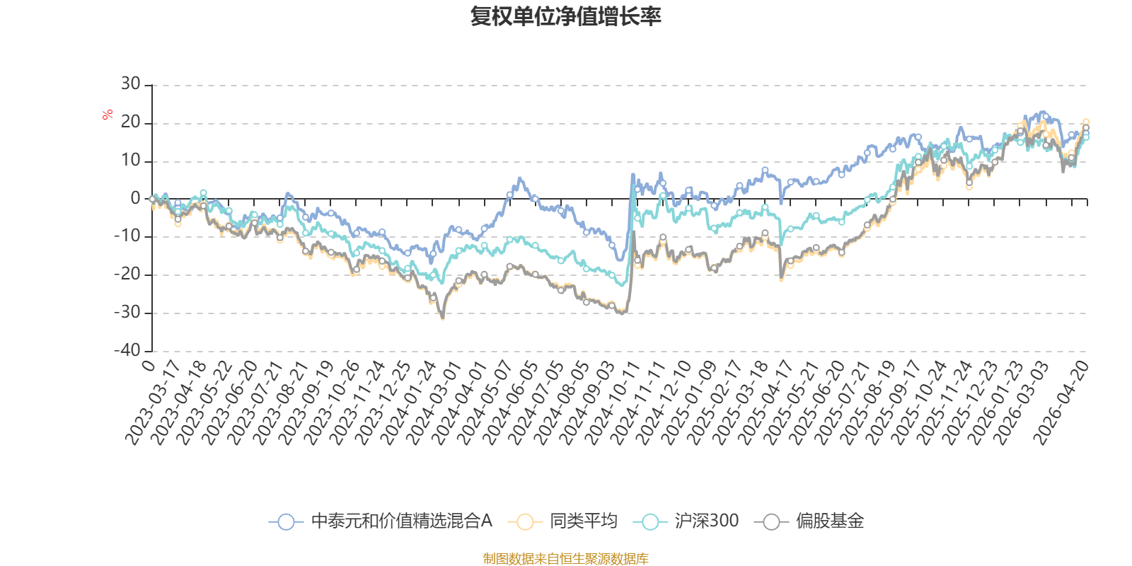 截至4月20日,中泰元和价值精选混合A近三个月复权单位净值增长率为-0.90%,位于同类可比基金173/265;近半年复权单位净值增长率为3.43%,位于同类可比基金207/265;近一年复权单位净值增长率为11.98%,位于同类可比基金248/265;近三年复权单位净值增长率为18.39%,位于同类可比基金160/261。