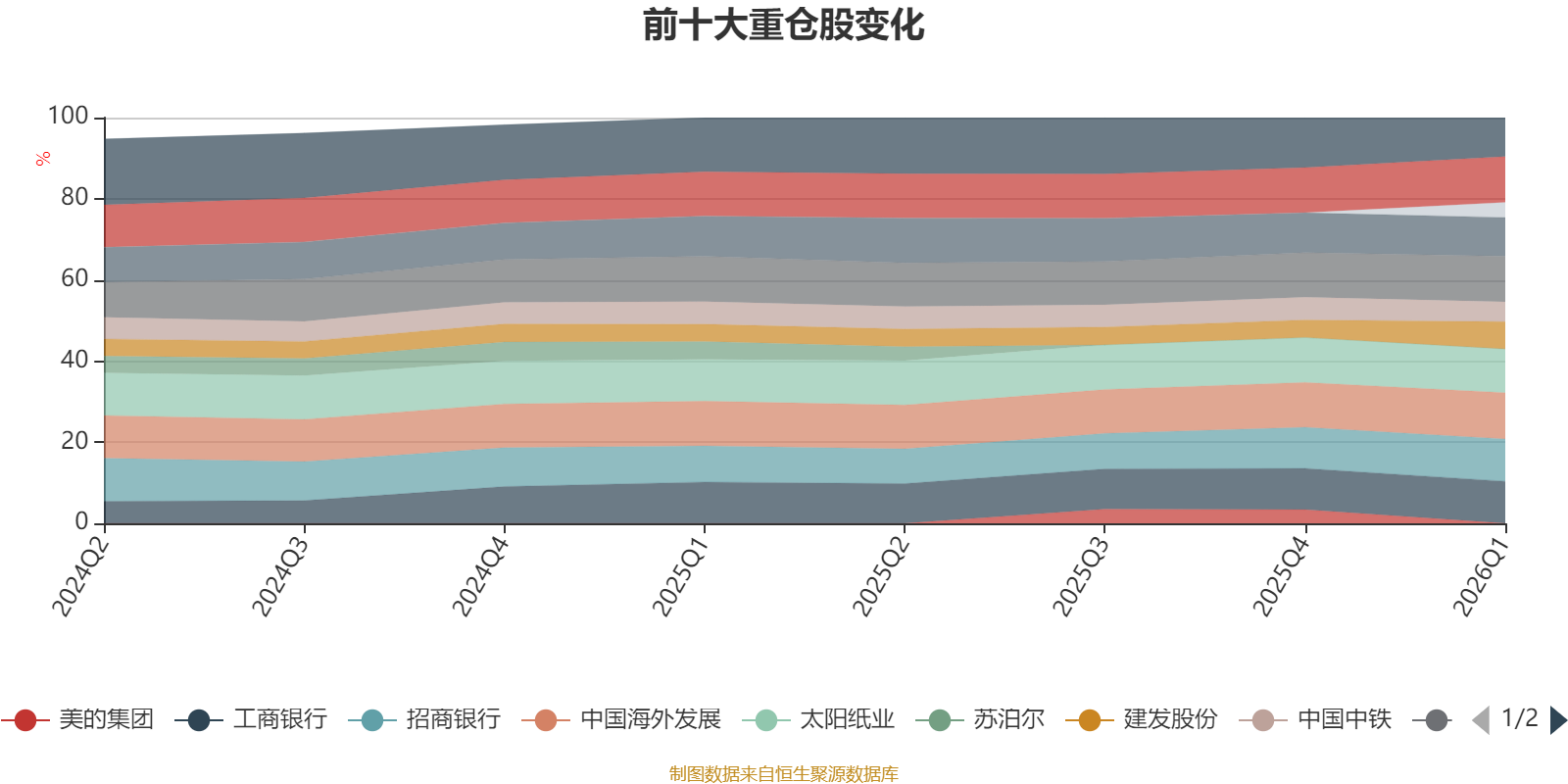 该基金持股集中度较高,且持股标的较为稳定,近2年前十大重仓股集中度长期超过60%。截至2026年一季度末,基金十大重仓股分别是中国海外发展、中国建筑、华润置地、太阳纸业、招商银行、工商银行、华鲁恒升、建发股份、中国中铁、海信视像。