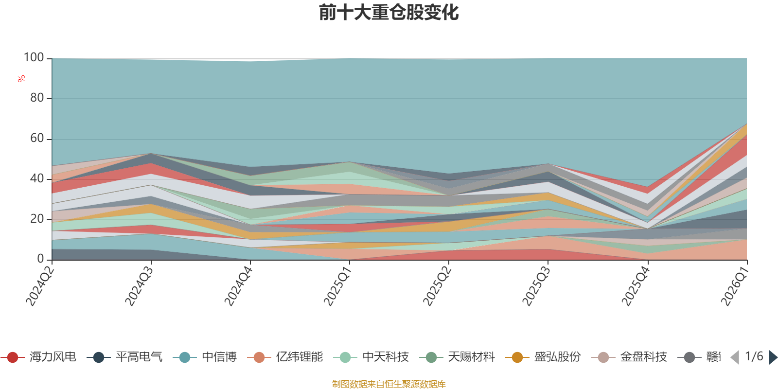 截至2026年一季度末,基金十大重仓股分别是德业股份、亿纬锂能、鹏辉能源、宁德时代、赣锋锂业、盐湖股份、锦浪科技、厦门钨业、海博思创、阳光电源。