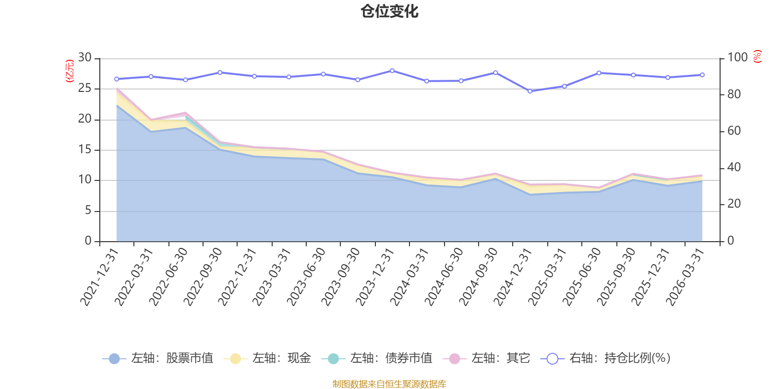 据定期报告数据统计,近三年平均股票仓位为89.23%,同类平均为87.03%。2023年末基金达到93.26%的最高仓位,2024年末最低,为82.08%。