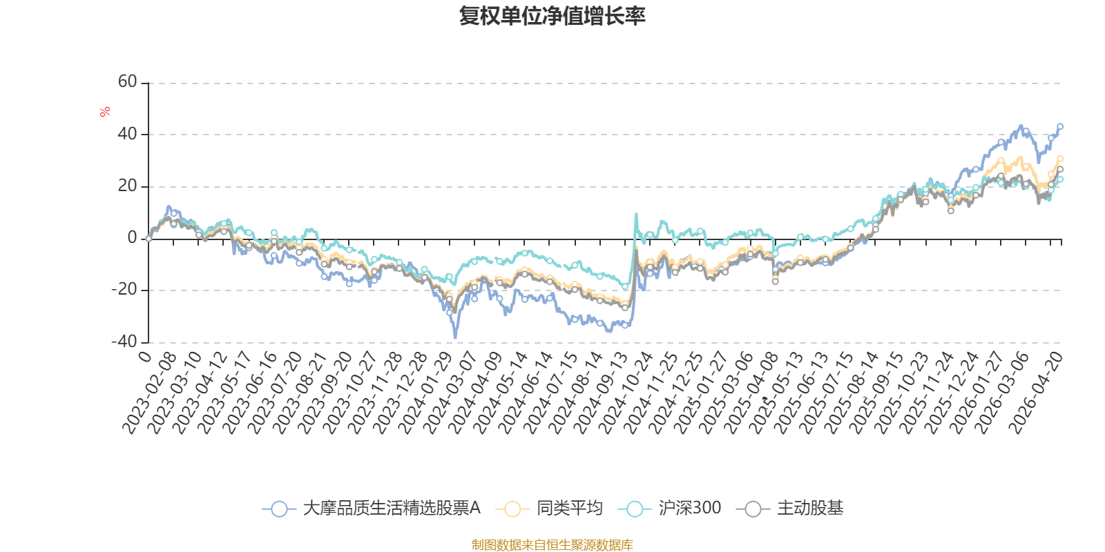 截至4月20日,大摩品质生活精选股票A近三个月复权单位净值增长率为6.12%,位于同类可比基金33/167;近半年复权单位净值增长率为23.81%,位于同类可比基金31/167;近一年复权单位净值增长率为59.47%,位于同类可比基金42/166;近三年复权单位净值增长率为39.69%,位于同类可比基金46/157。