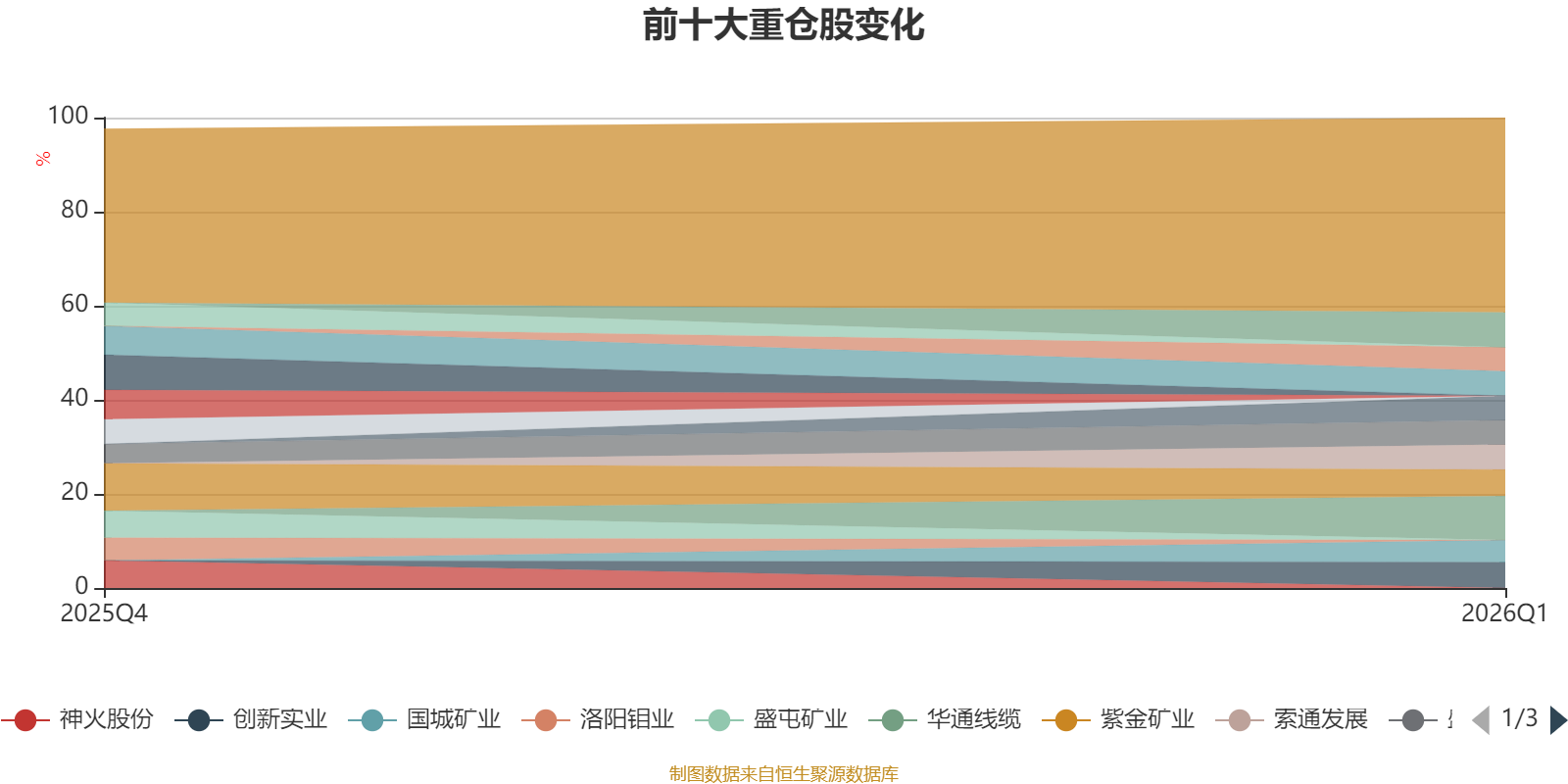 该基金持股集中度较高。截至2026年一季度末,基金十大重仓股分别是华通线缆、大中矿业、紫金矿业、创新实业、索通发展、紫金黄金国际、盛新锂能、中国海洋石油、招金矿业、国城矿业。