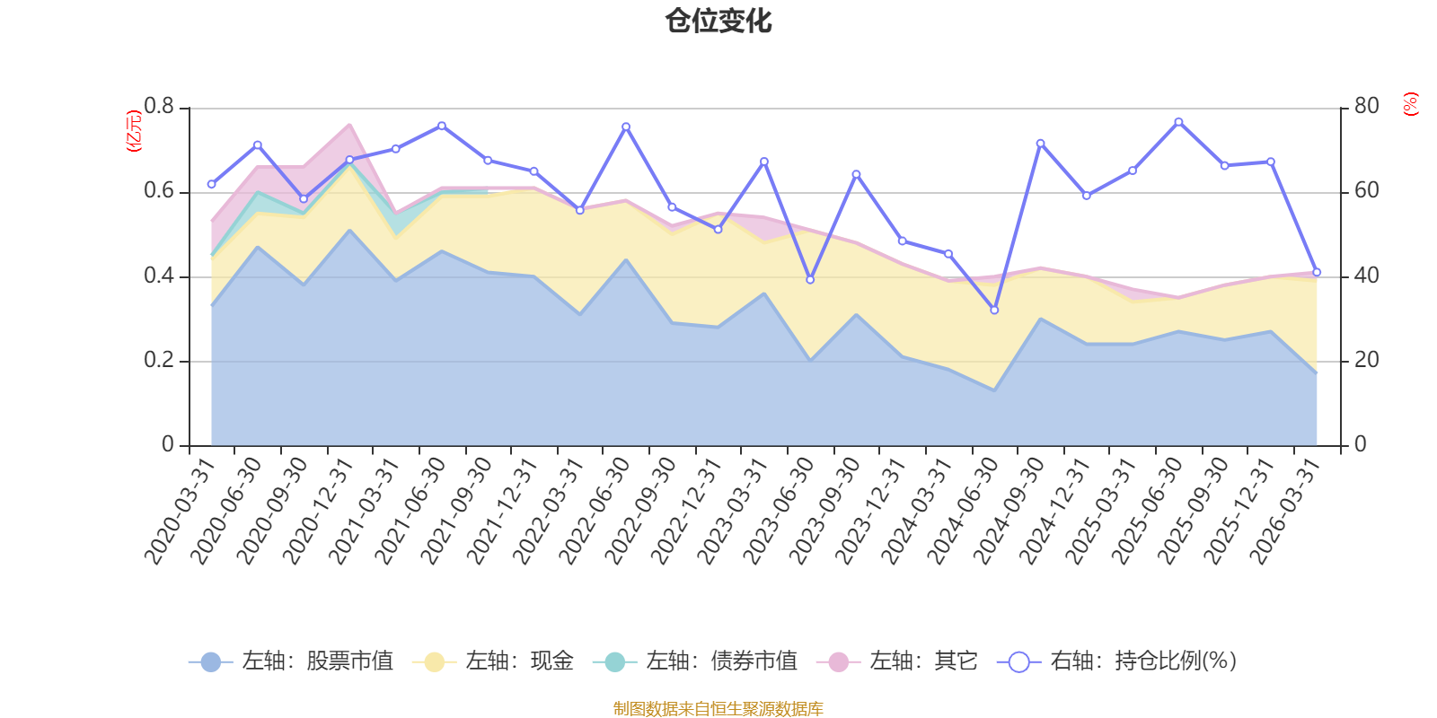 据定期报告数据统计,近三年平均股票仓位为56.38%,同类平均为72.59%。2025年上半年末基金达到76.65%的最高仓位,2024年上半年末最低,为32.08%。