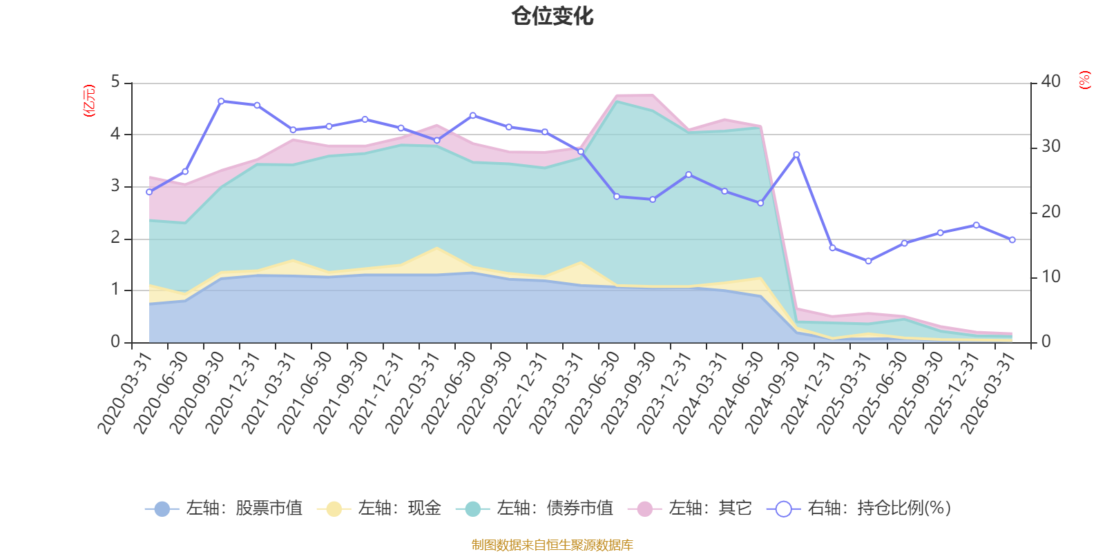 据定期报告数据统计,近三年平均股票仓位为19.79%,同类平均为72.59%。2020年三季度末基金达到37.18%的最高仓位,2025年一季度末最低,为12.56%。