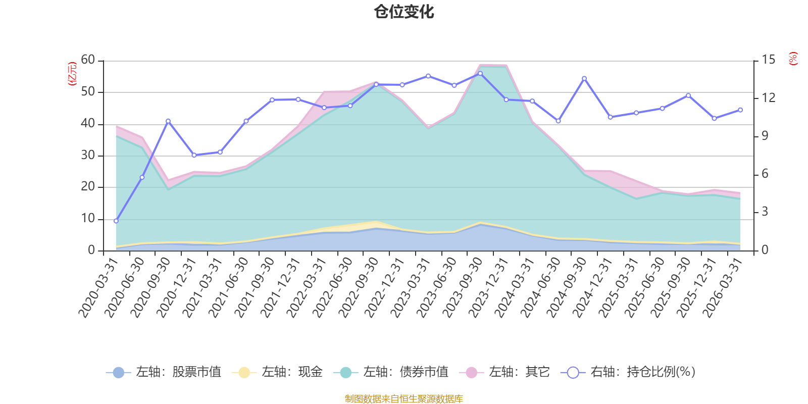 据定期报告数据统计,近三年平均股票仓位为11.75%,同类平均为72.59%。2023年三季度末基金达到13.99%的最高仓位,2020年一季度末最低,为2.35%。