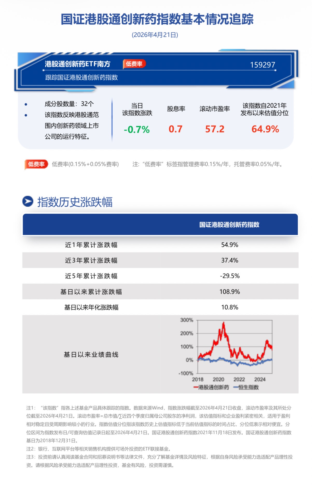 4月21日,国证港股通创新药指数延续震荡调整态。截至收盘,指数报2089.12点,跌幅0.66%。从阶段性表现看,该指数近一月累计上涨14.36%,近三月上涨3.84%,今年以来累计涨幅12.29%,近一年涨幅达55.91%,中长期上行趋势依然稳健。港股通创新药ETF南方(159297)今日跟随指数同步震荡,成交额8745.72万元。从流动性看,该基金近20个交易日累计成交金额44.25亿元,日均成交2.21亿元,交投保持活跃。
