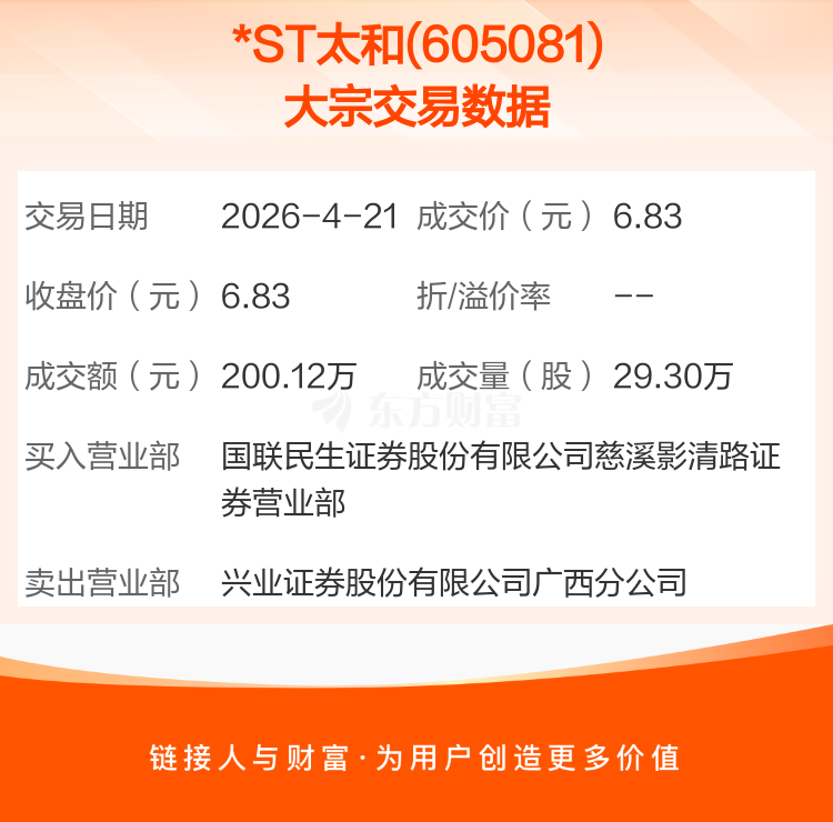 2026年4月21日,*ST太和发生1笔大宗交易,共成交29.30万股,成交金额200.12万元,占其流通市值比例为0.26%。