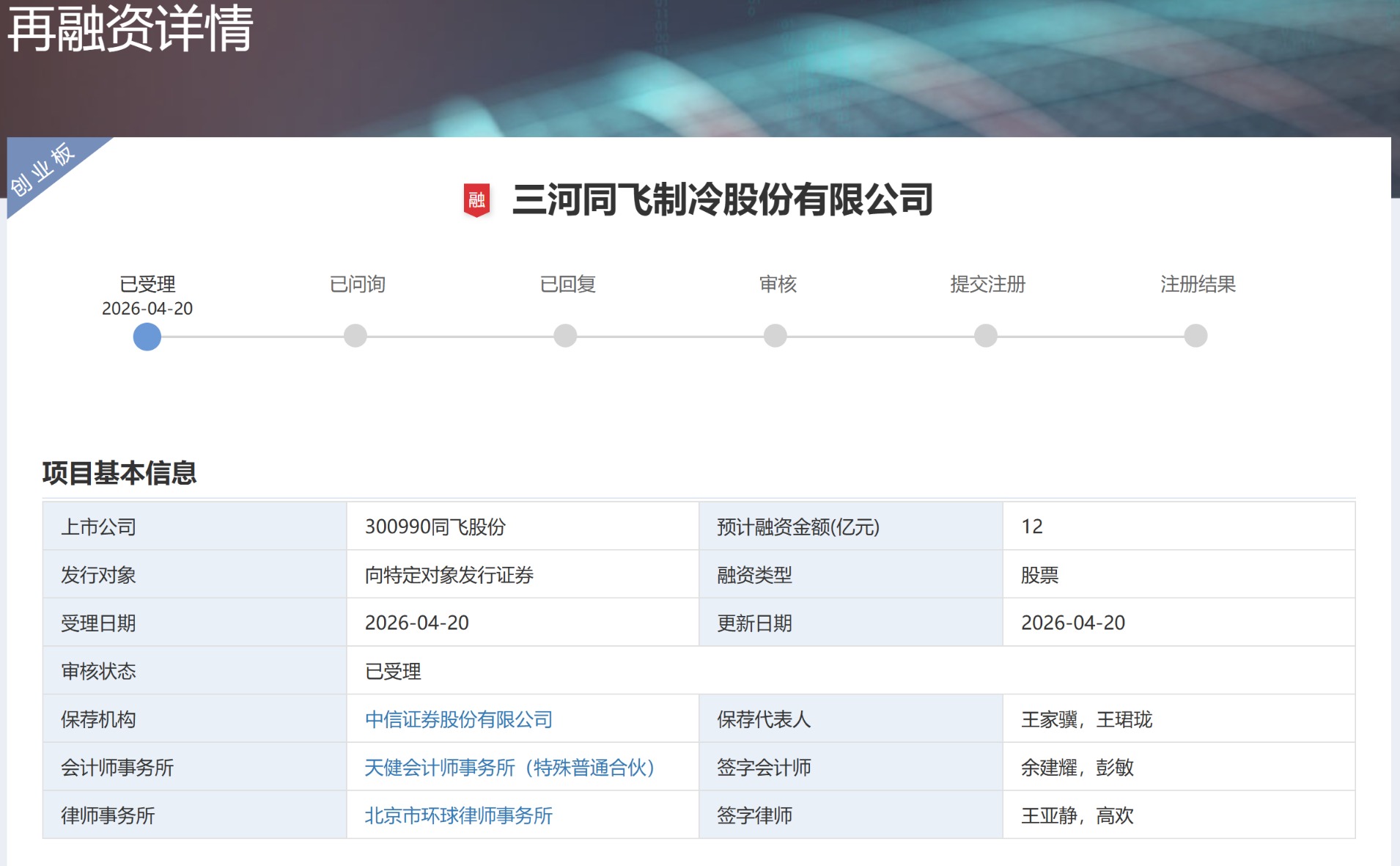 上证报中国证券网讯 4月21日晚间,同飞股份公告披露,公司于近日收到深圳证券交易所出具的《关于受理三河同飞制冷股份有限公司向特定对象发行股票申请文件的通知》(深证上审〔2026〕75号)。深交所对公司报送的向特定对象发行股票的申请文件进行了核对,认为申请文件齐备,决定予以受理。