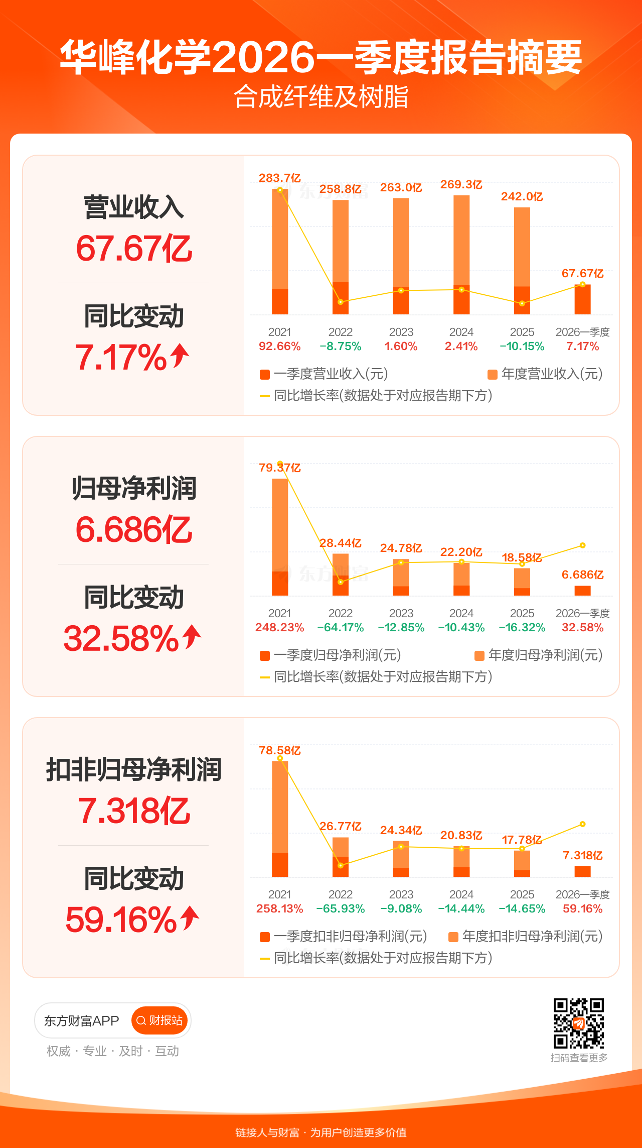 华峰化学4月22日发布2026年一季报显示,公司一季度实现营业收入67.67亿元,同比增长7.17%;归母净利润6.69亿元,同比增长32.58%;扣非归母净利润7.32亿元,同比增长59.16%。