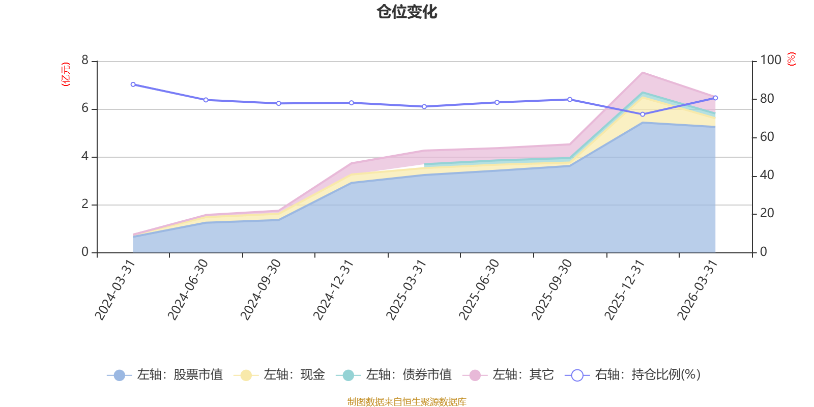据定期报告数据统计,成立以来平均股票仓位为79.02%,同类平均为85.8%。2024年一季度末基金达到87.8%的最高仓位,2025年末最低,为72.21%。