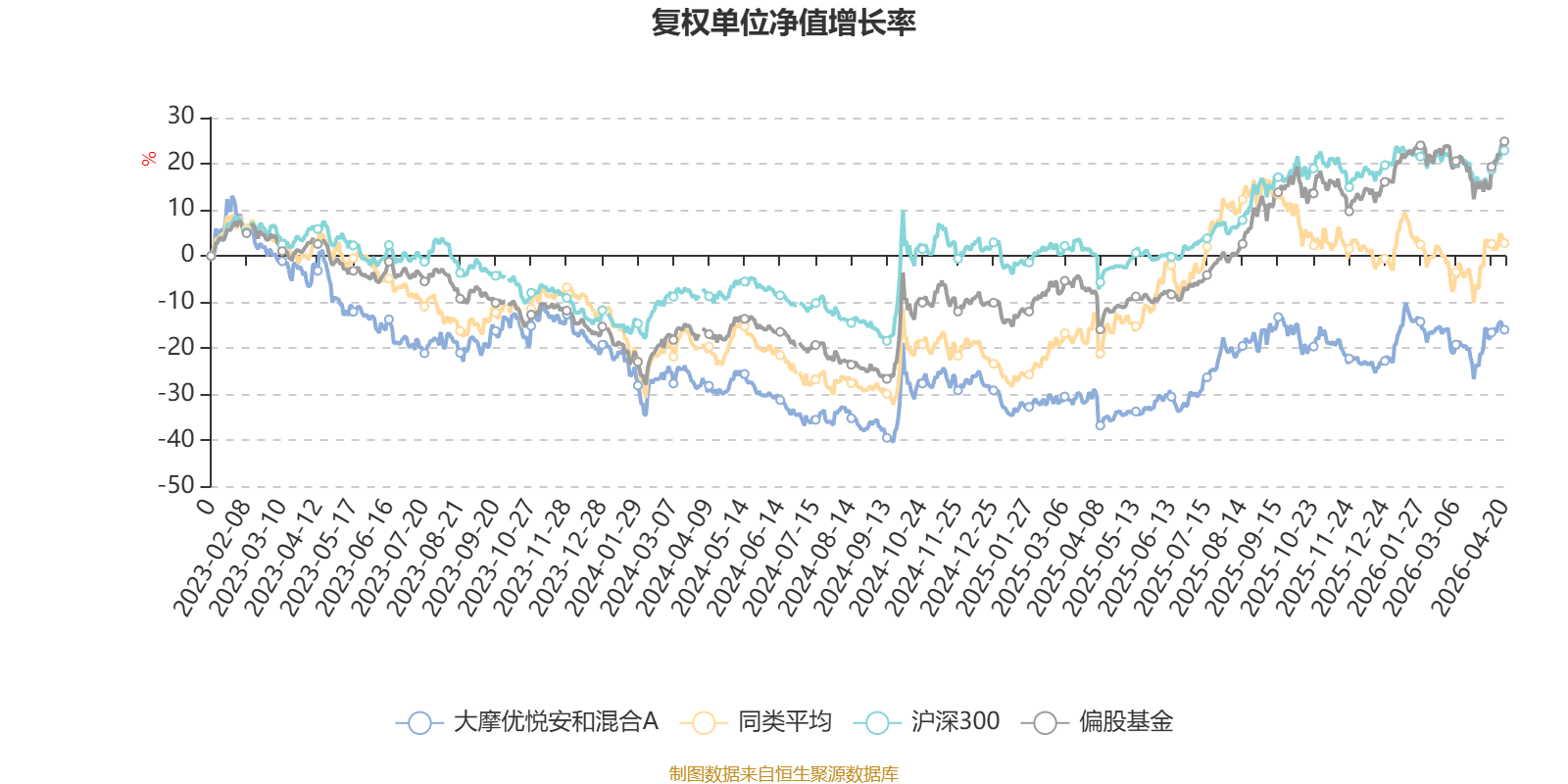 截至4月20日,大摩优悦安和混合A近三个月复权单位净值增长率为-1.98%,位于同类可比基金56/106;近半年复权单位净值增长率为5.19%,位于同类可比基金9/106;近一年复权单位净值增长率为30.21%,位于同类可比基金29/104;近三年复权单位净值增长率为-13.21%,位于同类可比基金63/80。