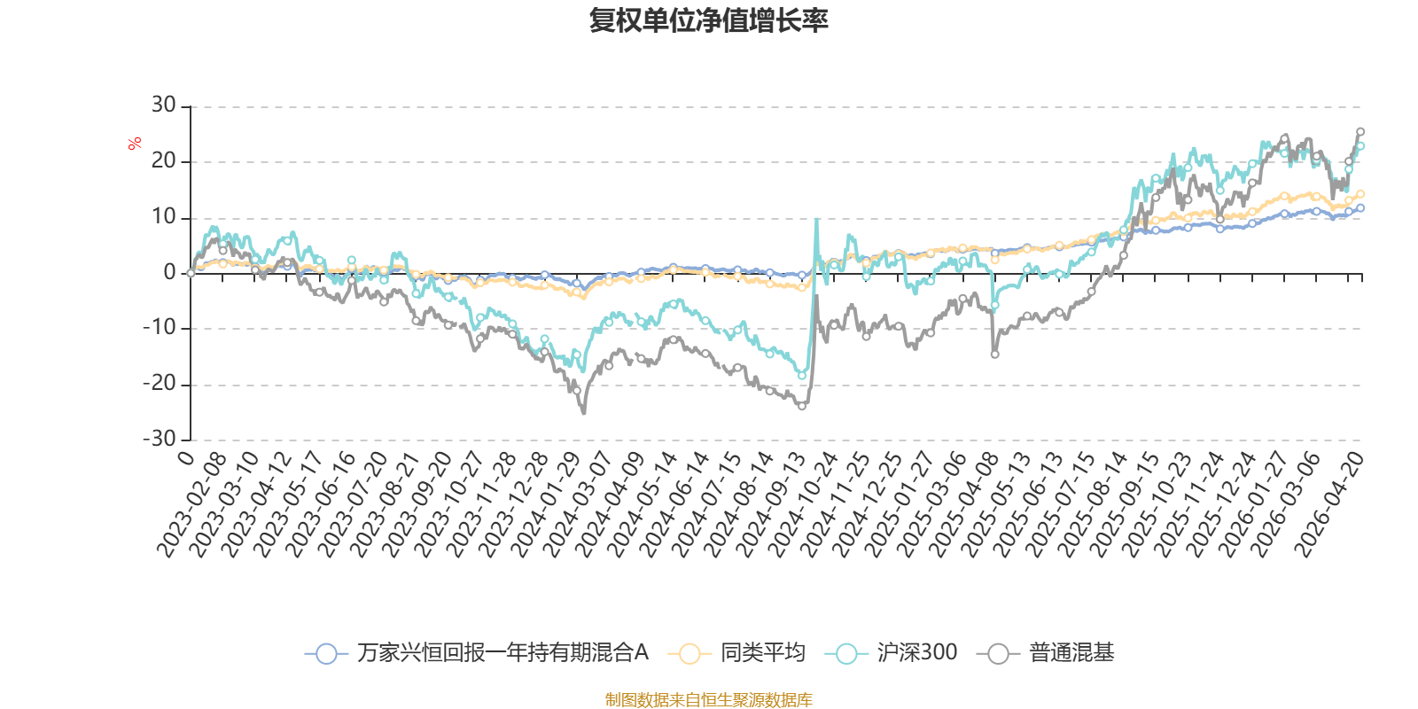 截至4月20日,万家兴恒回报一年持有期混合A近三个月复权单位净值增长率为1.28%,位于同类可比基金159/629;近半年复权单位净值增长率为3.50%,位于同类可比基金216/629;近一年复权单位净值增长率为7.40%,位于同类可比基金319/629;近三年复权单位净值增长率为10.73%,位于同类可比基金318/582。